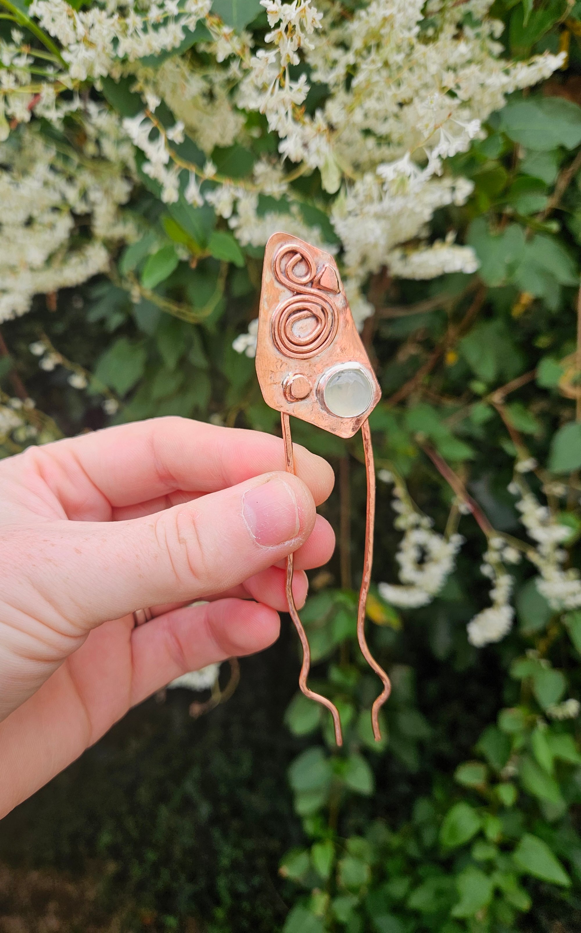 Copper hair pin /hair decoration jewel with copper swirl and pale green translucent Prehnite gemstone. Just pop in a hair bun /updo to pretty your hair up.
