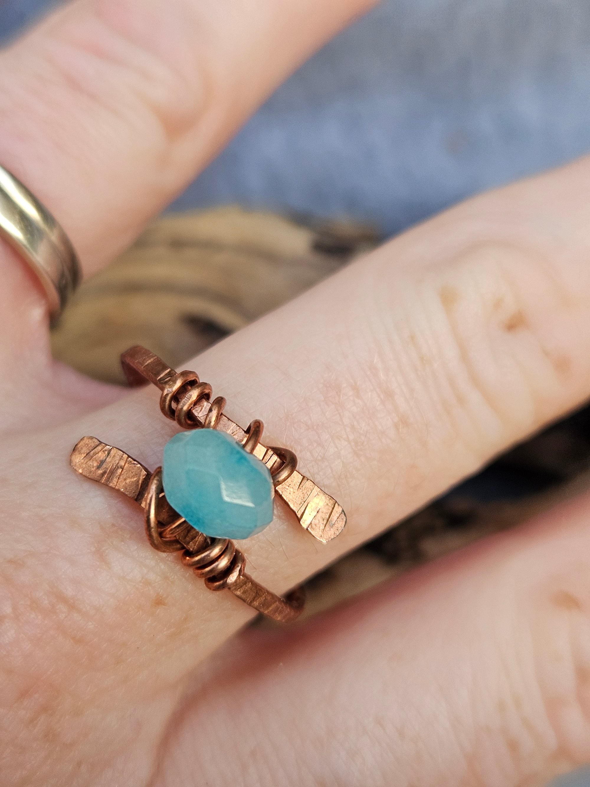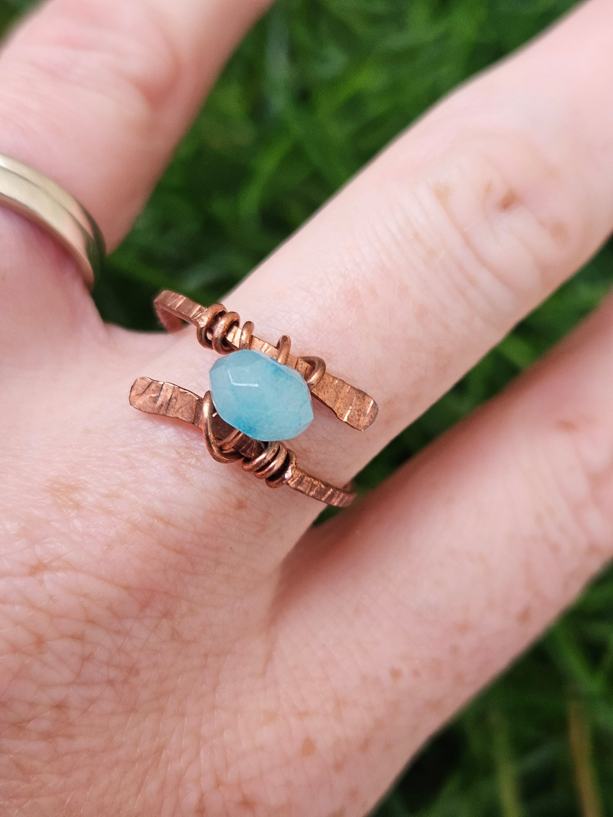 Gorgeous but simple copper metal wire ring with wire wrapped glass bead on it in turquoise blue colour. Its a UK size S. Please note im only shipping this piece to UK customers.