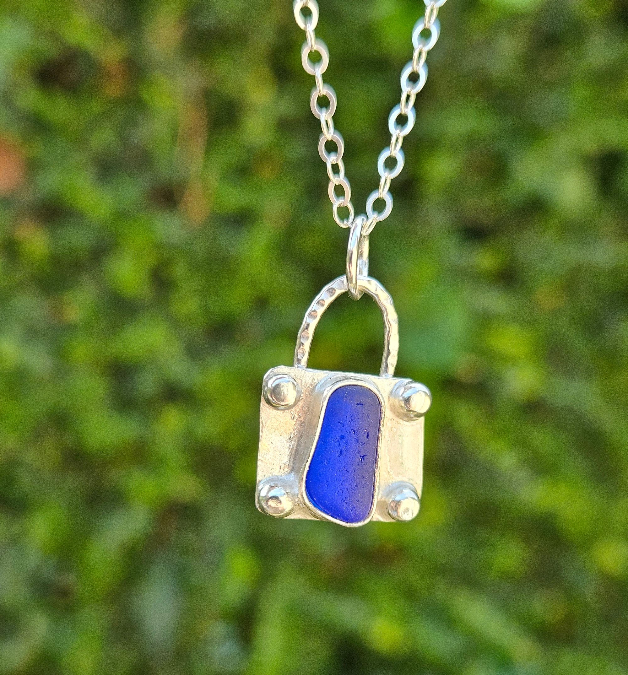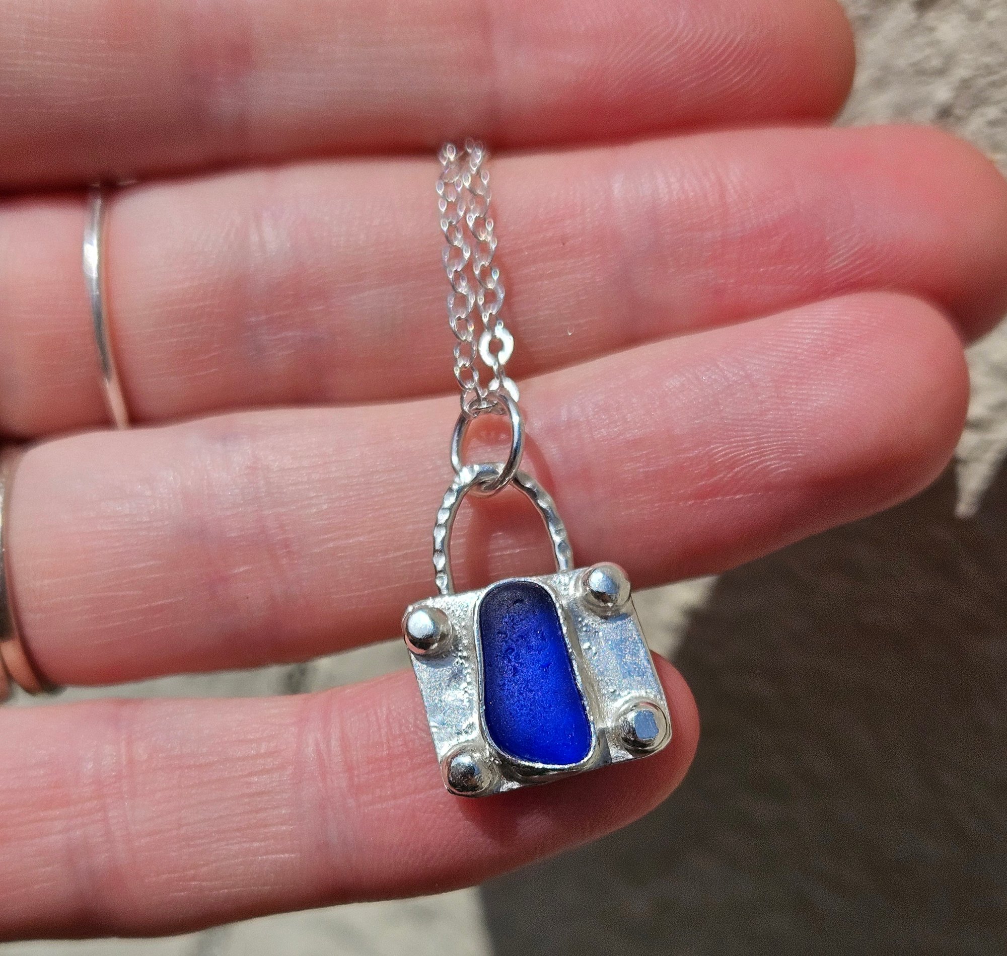 A beautiful bezel set seaglass necklace in .925 sterling silver. Made using a piece of cobalt blue seaglass found here on a cornish beach. On a 0.5mm thick sterling silver backing with sterling silver bezel wire setting and ive added 4 recycled silver balls. I also made the decorative bail out of silver wire.