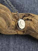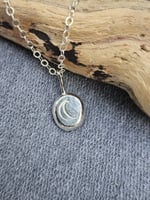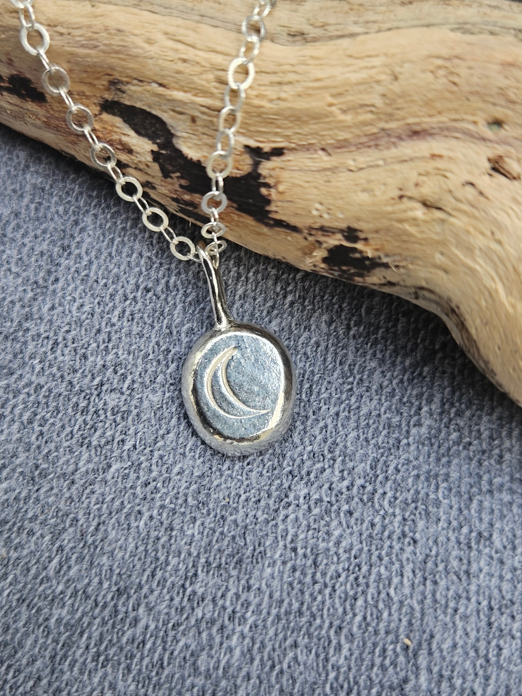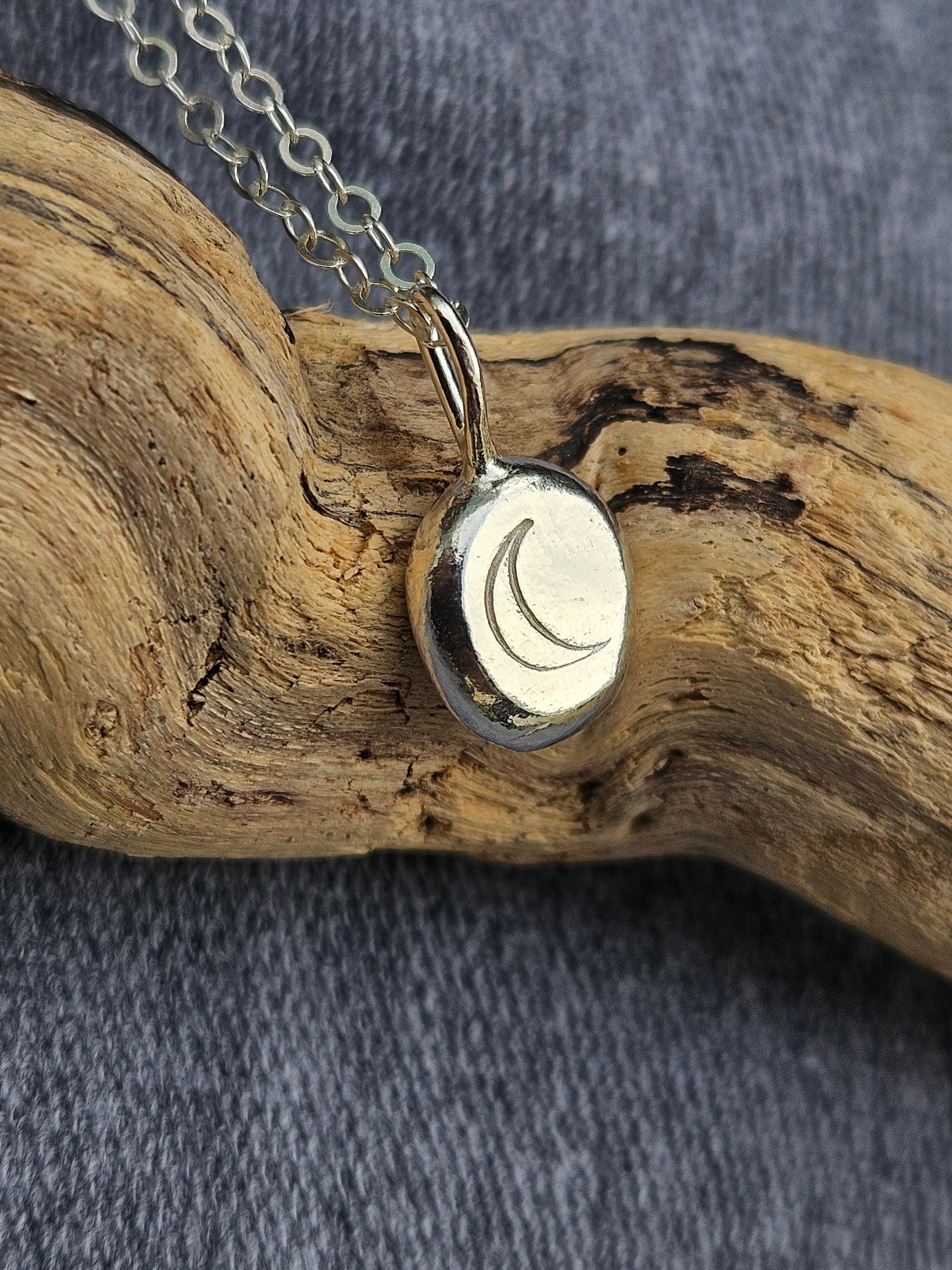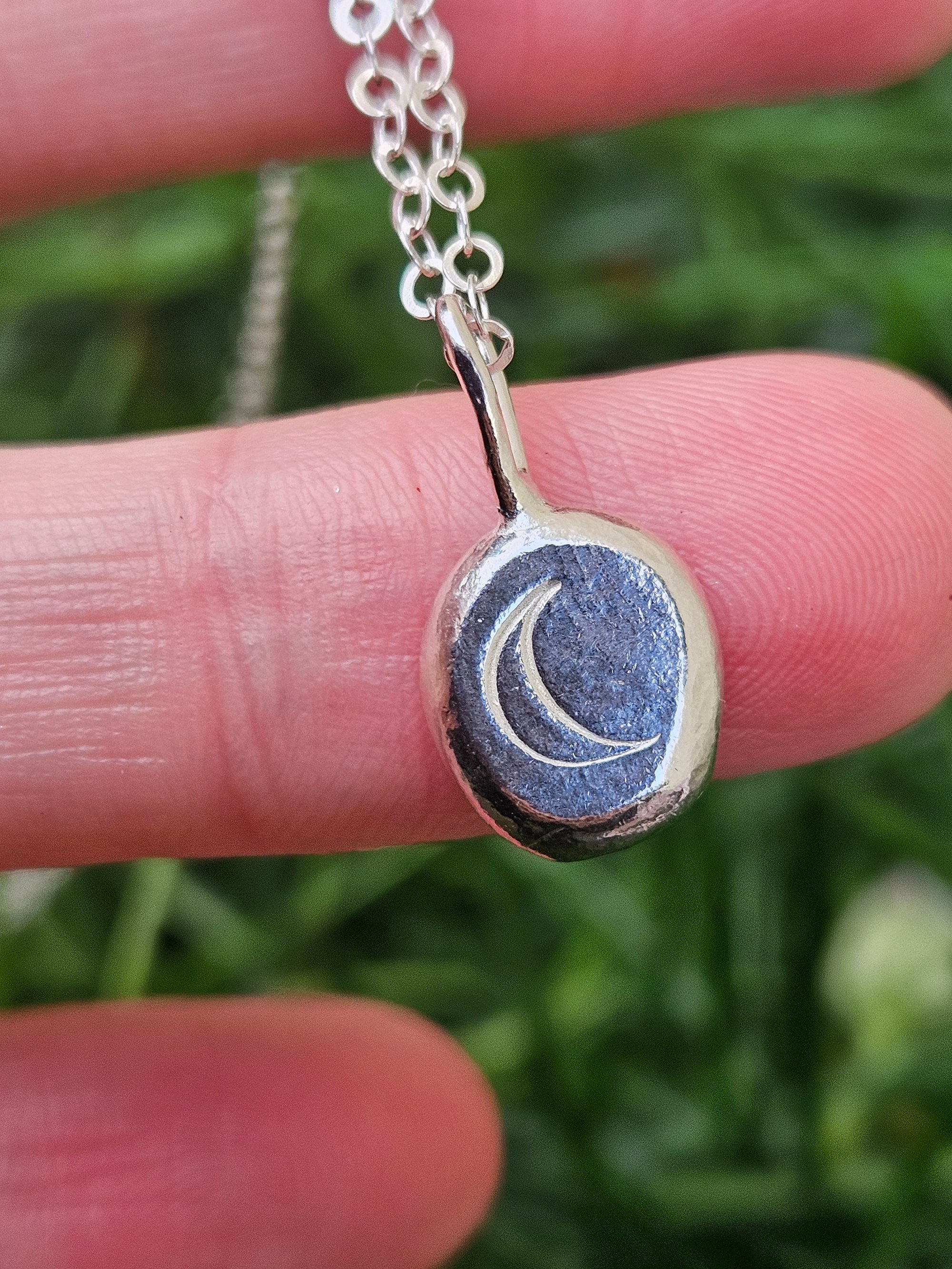 Handmade Sterling silver necklace featuring a pebble of sterling silver that I formed into a pebble by melting lots of pieces of sterling silver with my blowtorch ive then hammered to the shape I wanted and handstamped a crescent moon into the pendant. I then made and soldered on a wire side bail. Finished by polishing to a shine. Dainty pendant approx 1.5cm long.