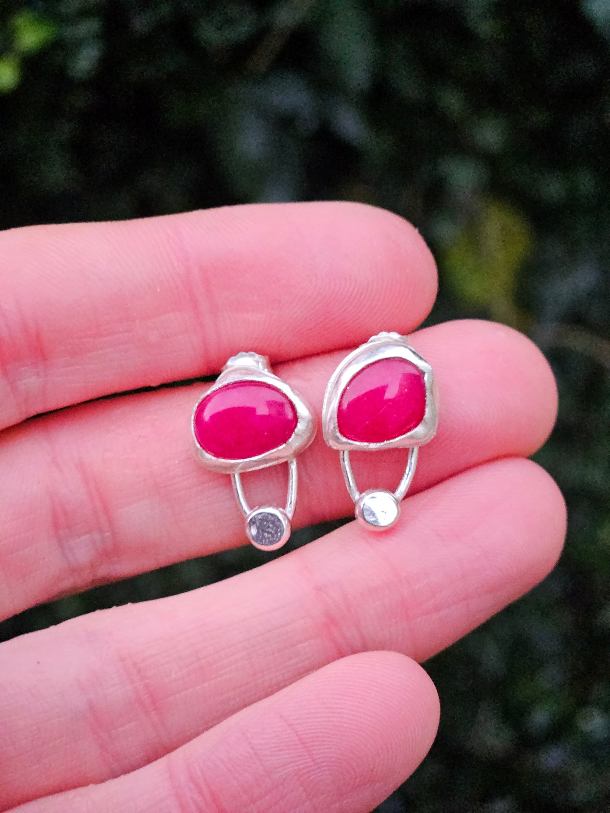 Stud Earrings with sterling silver bezel set fuchsia pink agate gemstone cabochons.