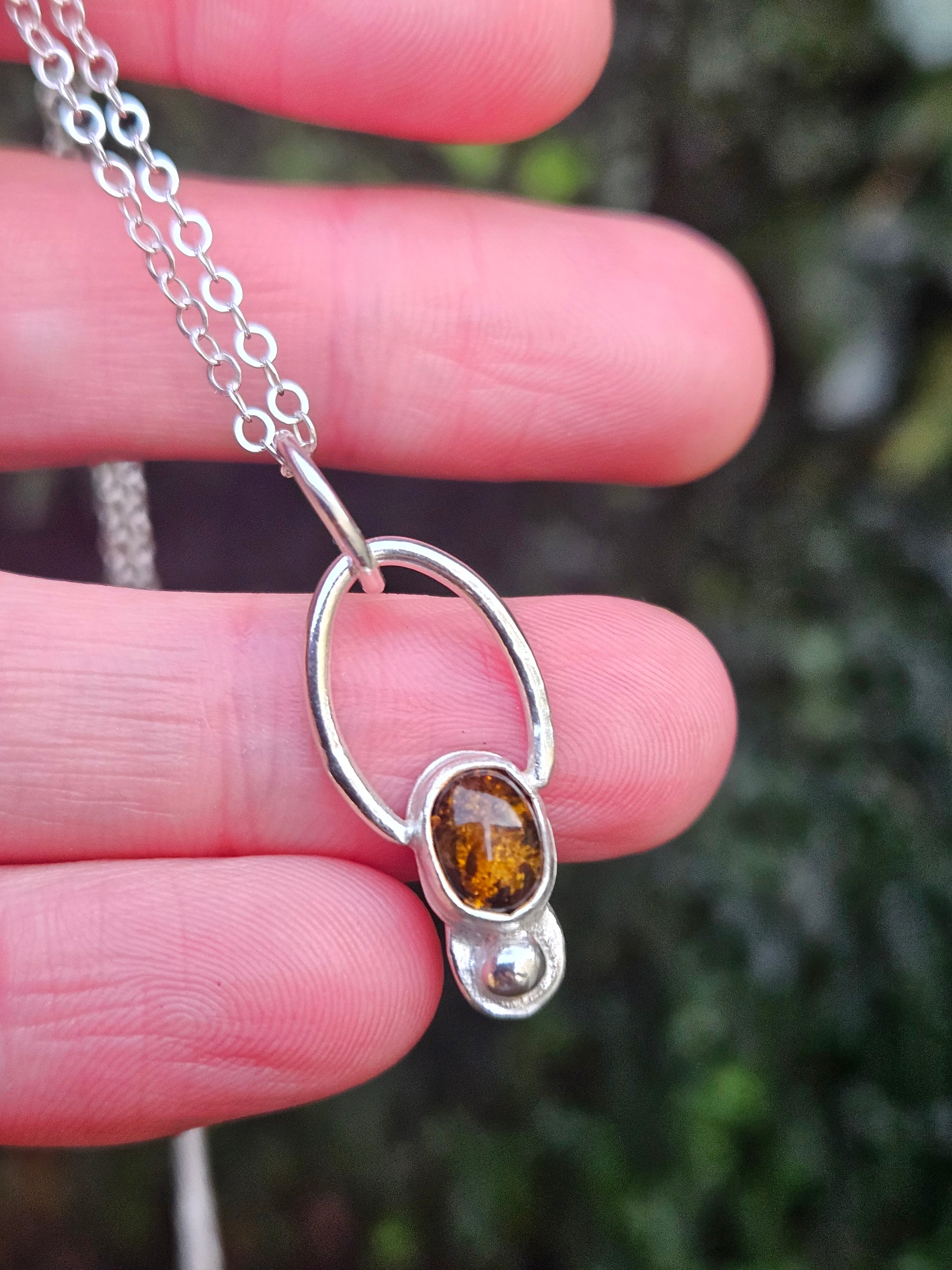 Handmade beautiful necklace featuring amber gemstone in a sterling silver setting which is simple and classy letting the gemstone do the talking. Approx 2.5cm in length and 1cm wide.