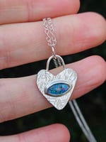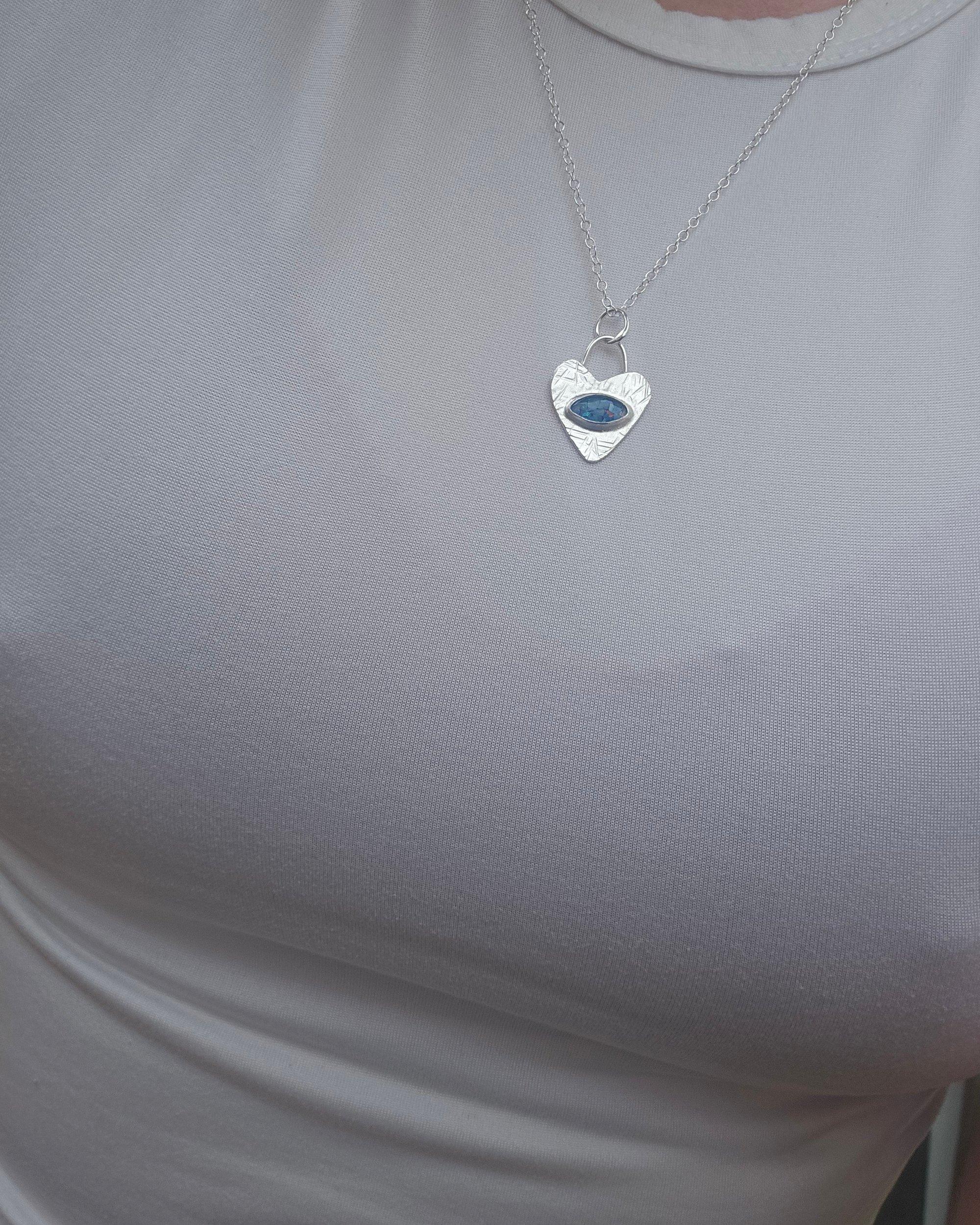 A beautiful handmade necklace featuring a sterling silver handcut heart which is 0.6mm thick with a wire bail and a marquise shape opal mosaic triplet stone which ive set into a handmade sterling silver wire bezel setting. Ive hammered the metal backplate for a cool look and texture.