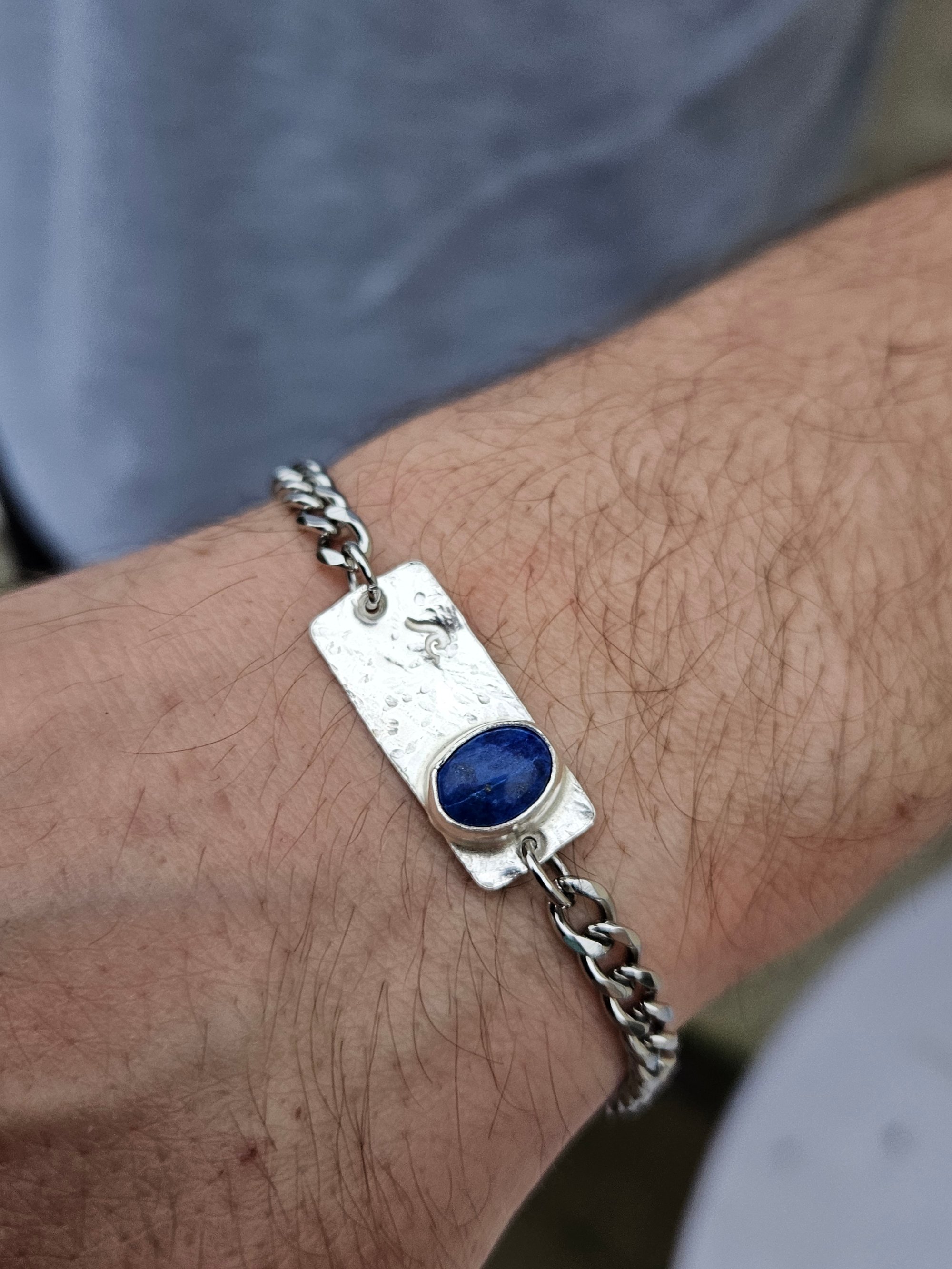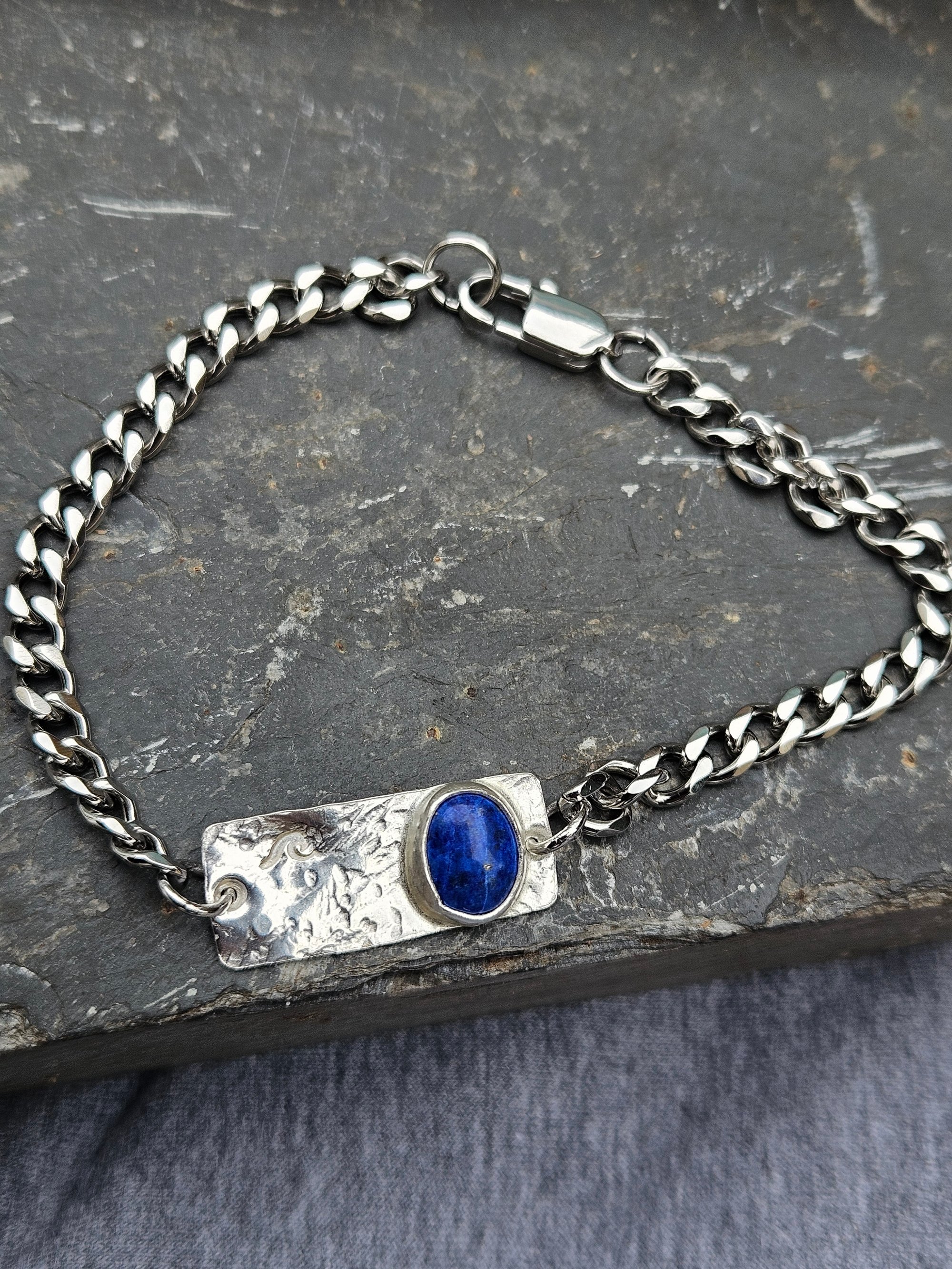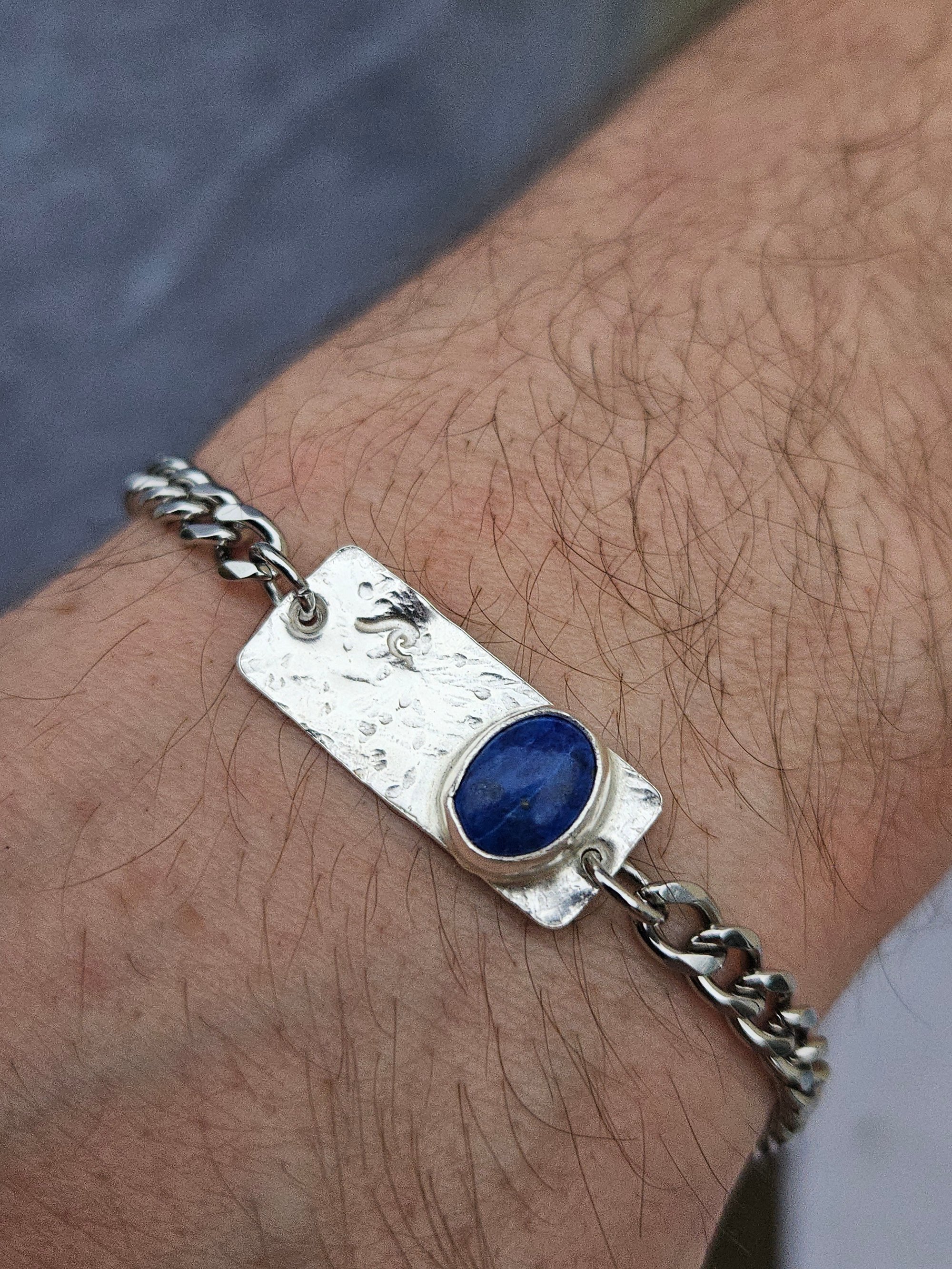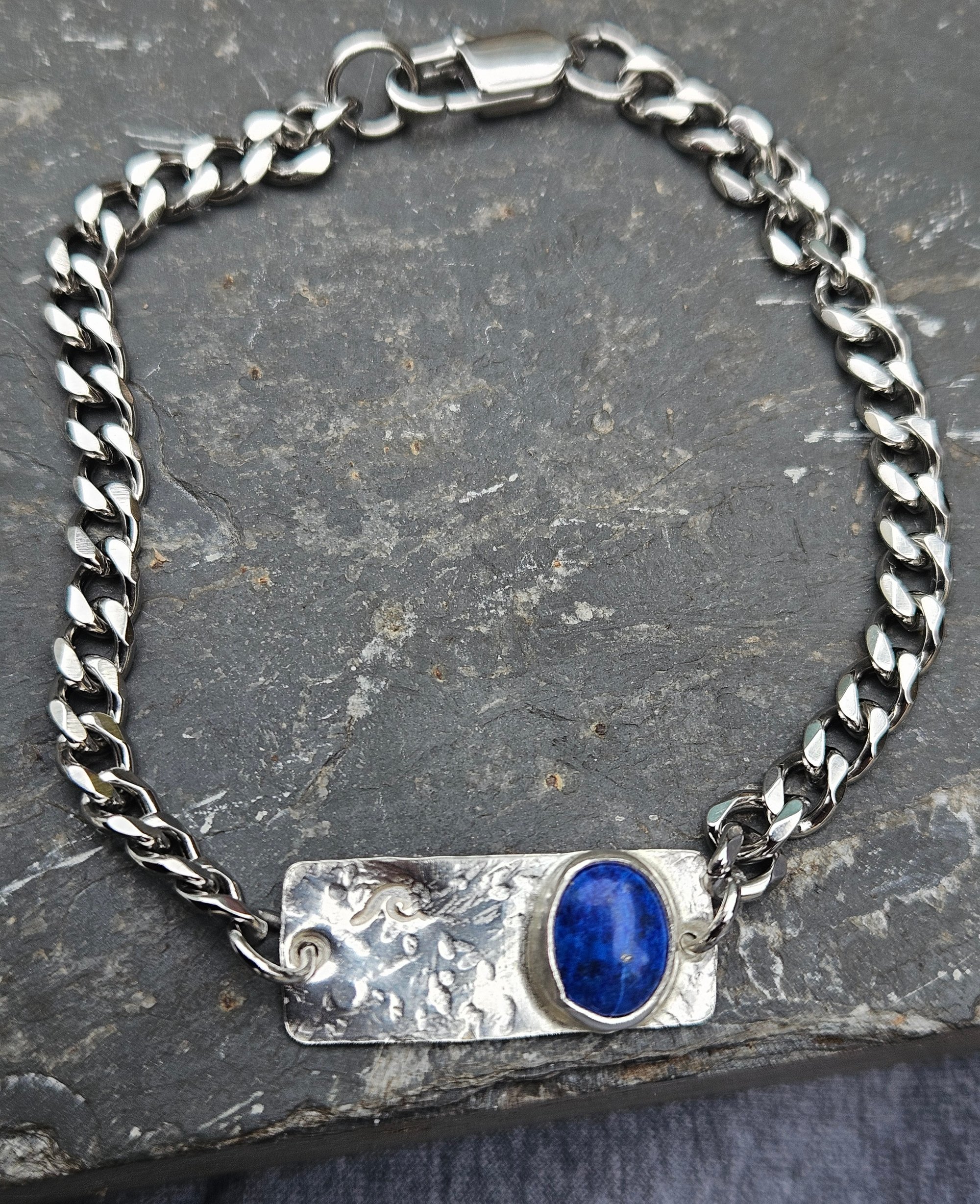 Ive handmade the centre piece of the bracelet using sterling silver sheet metal that ive hammered and ive given it a rustic look. Ive handstamped a wave into it and it has a oval lapis lazuli gemstone cabochon which is bezel set. This is a dark blue colour.