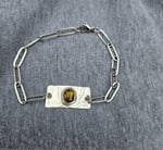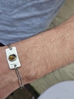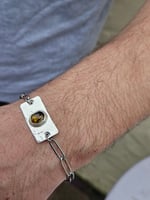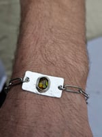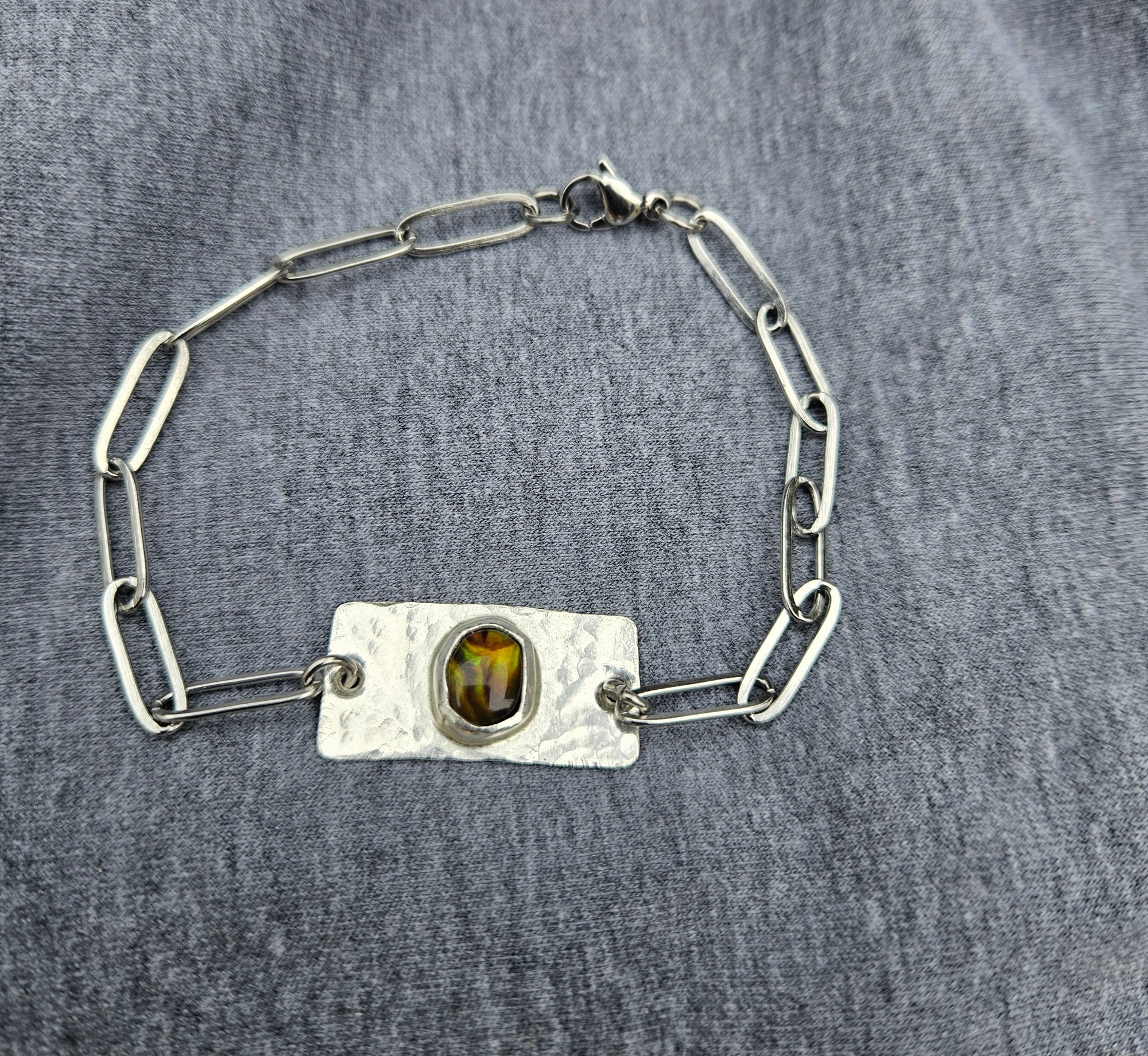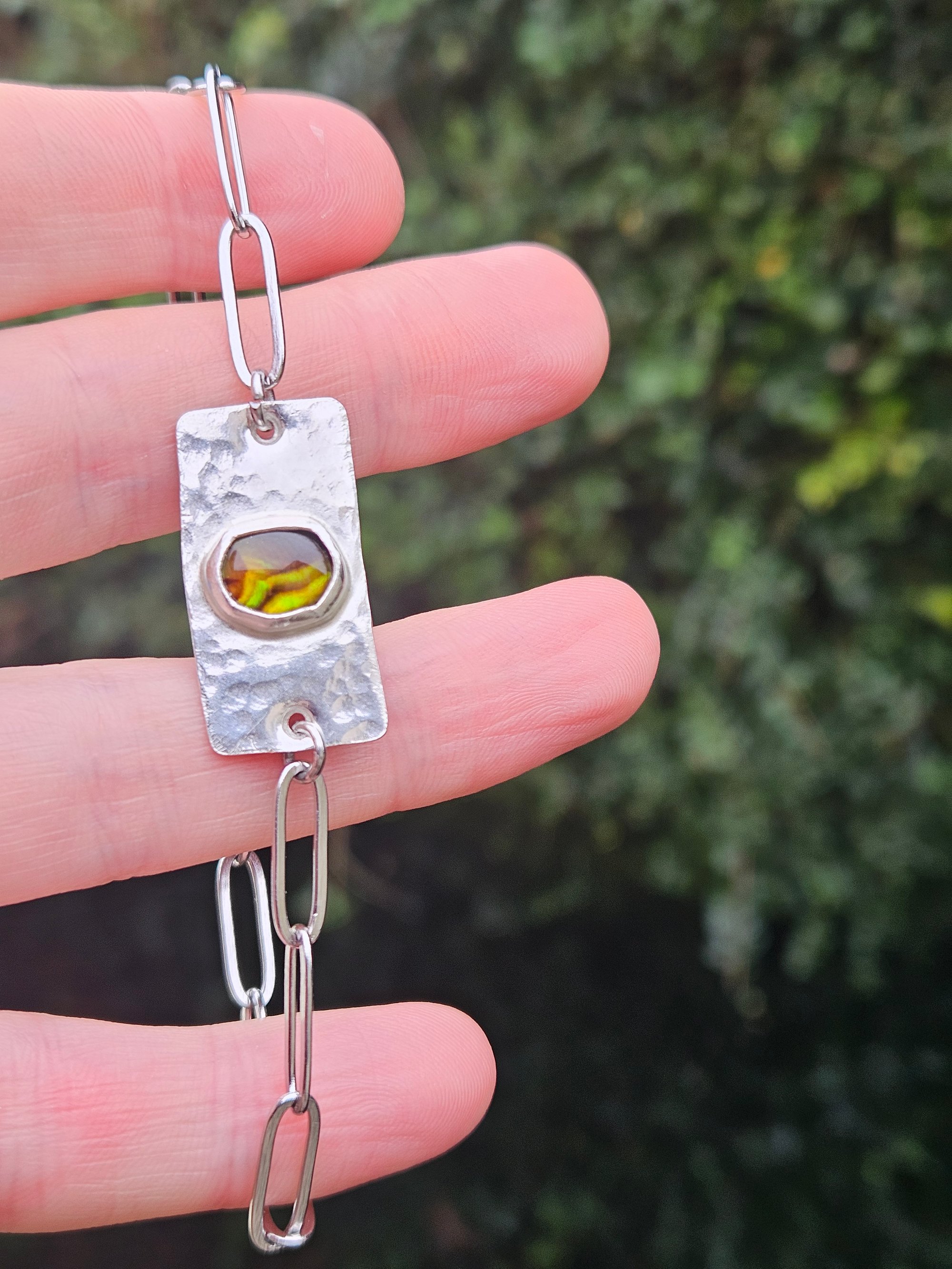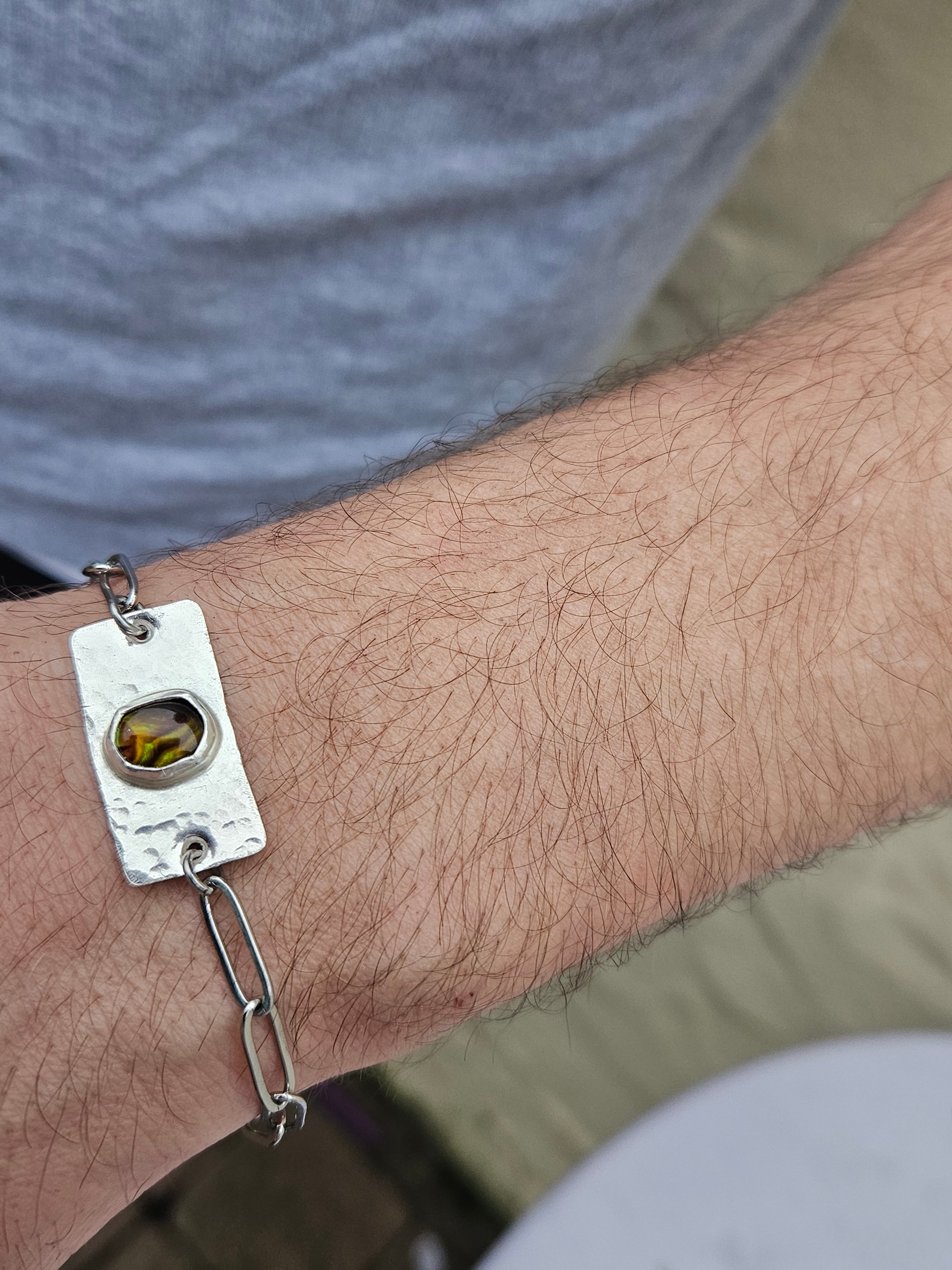 Ive handmade the centre piece of the bracelet using sterling silver sheet metal that ive hammered with a dimpled effect. Then ive bezel set an oval bronze paua shell cabochon.