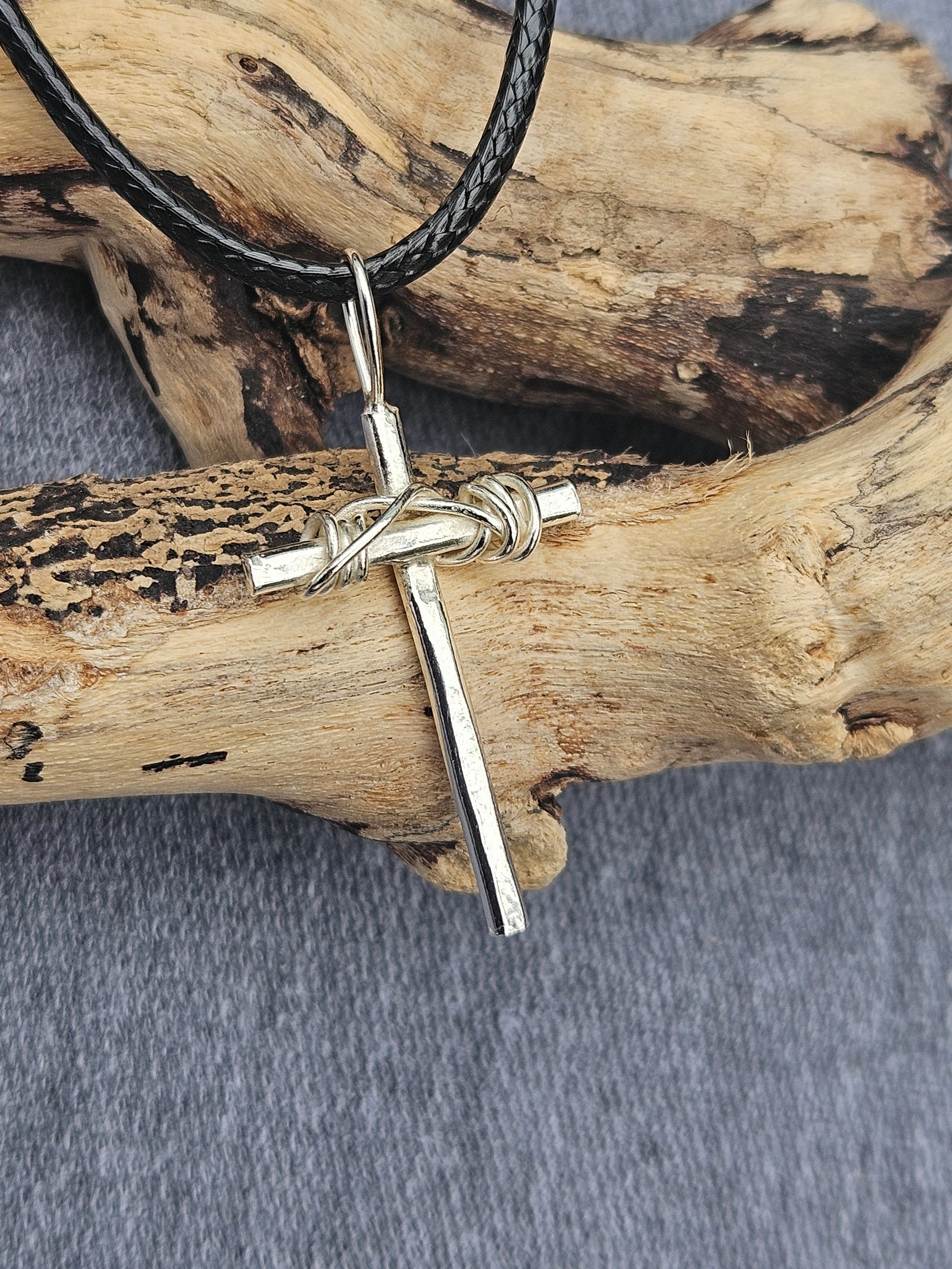 Handmade Sterling silver cross necklace made by me with thick sterling silver ' D' wire and ive added extra sterling silver wire wrapped around it. All soldered together and secure. Approx 5cm long and 3cm wide.