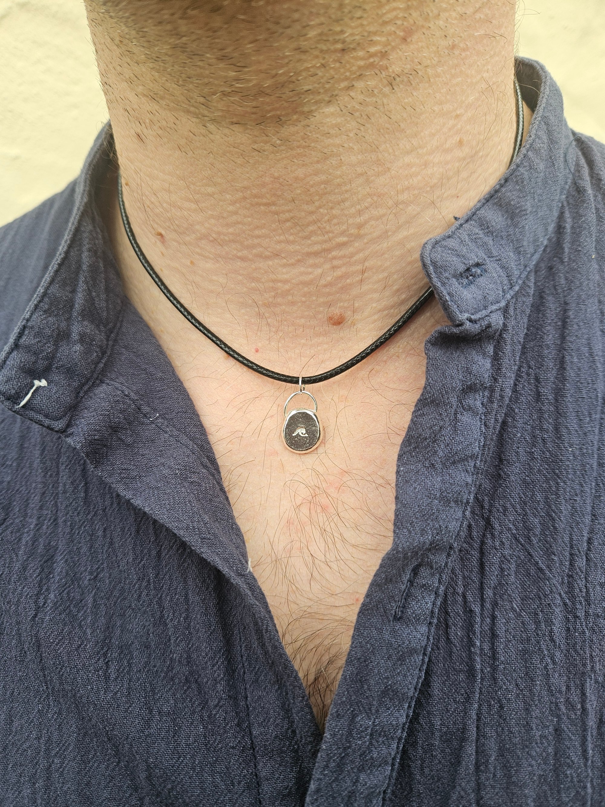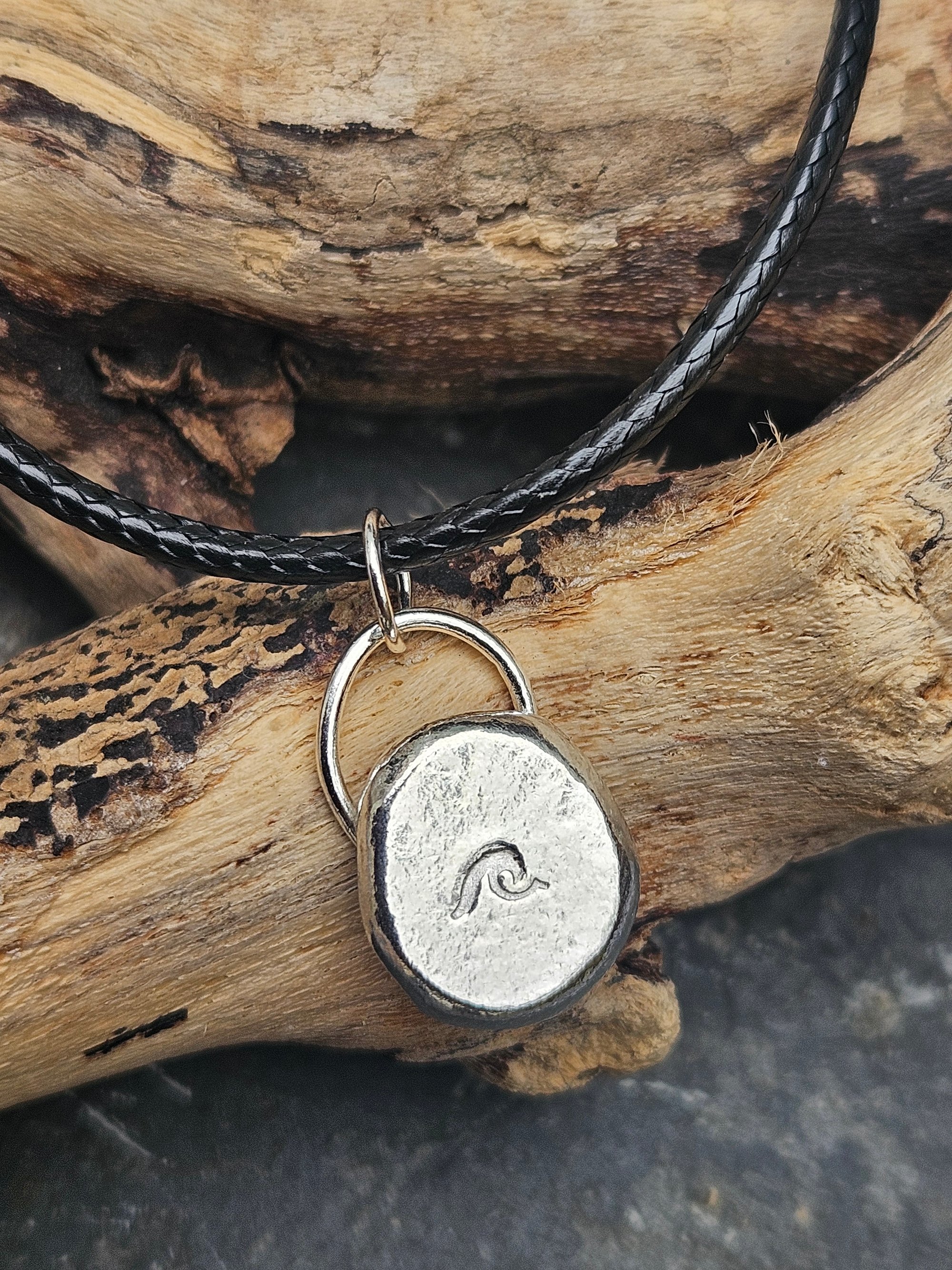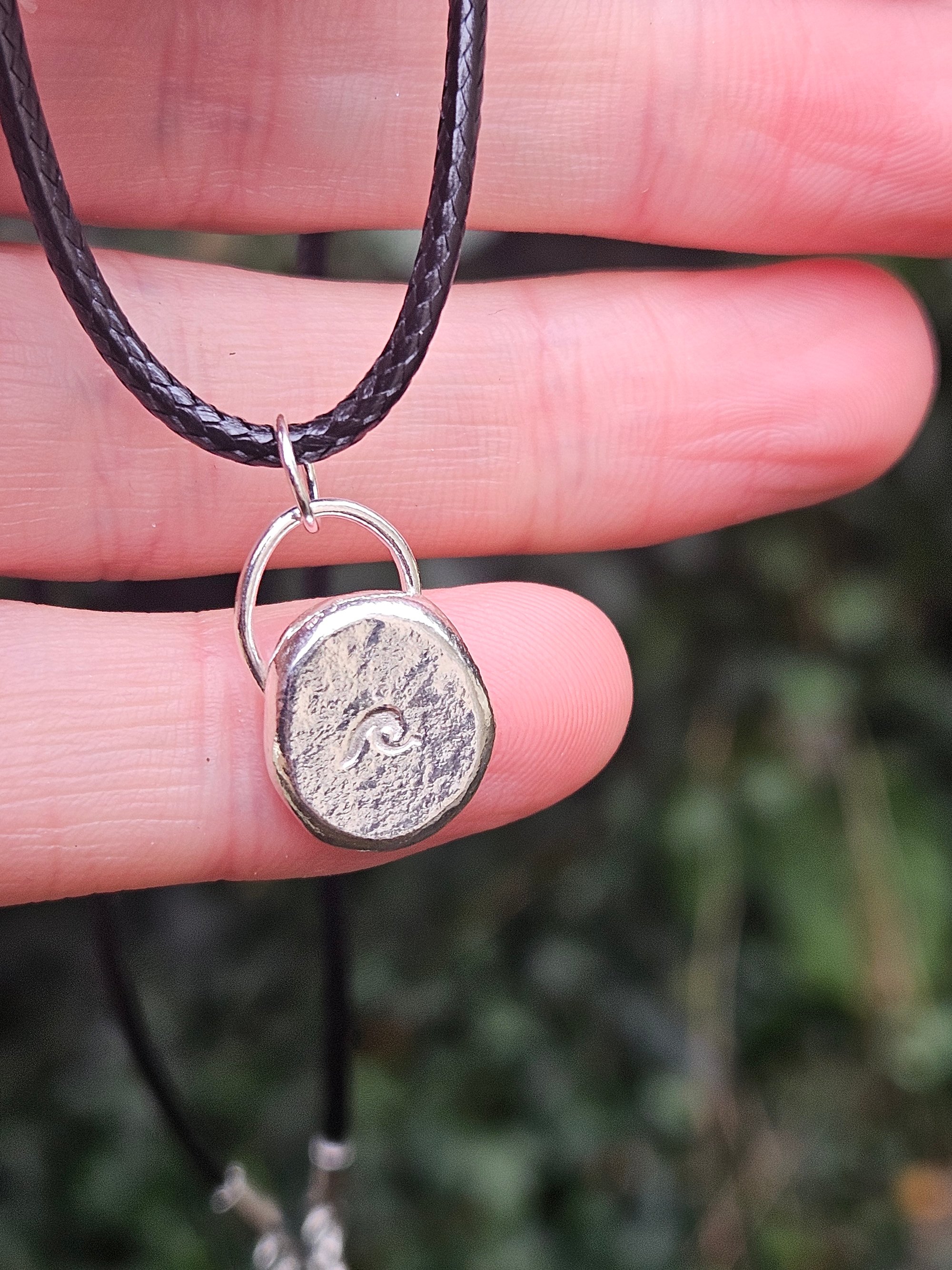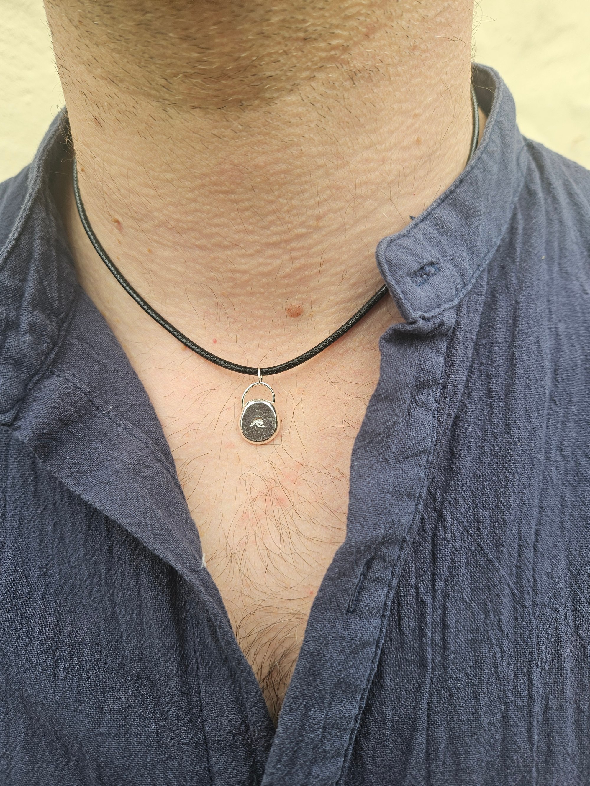 Mens necklace handmade by me featuring a fairly large chunk of melted recycled silver that i melted with my blowtorch into a puddle. Once it hardened again ive hammered it flatter and handstamped a wave onto it.