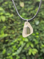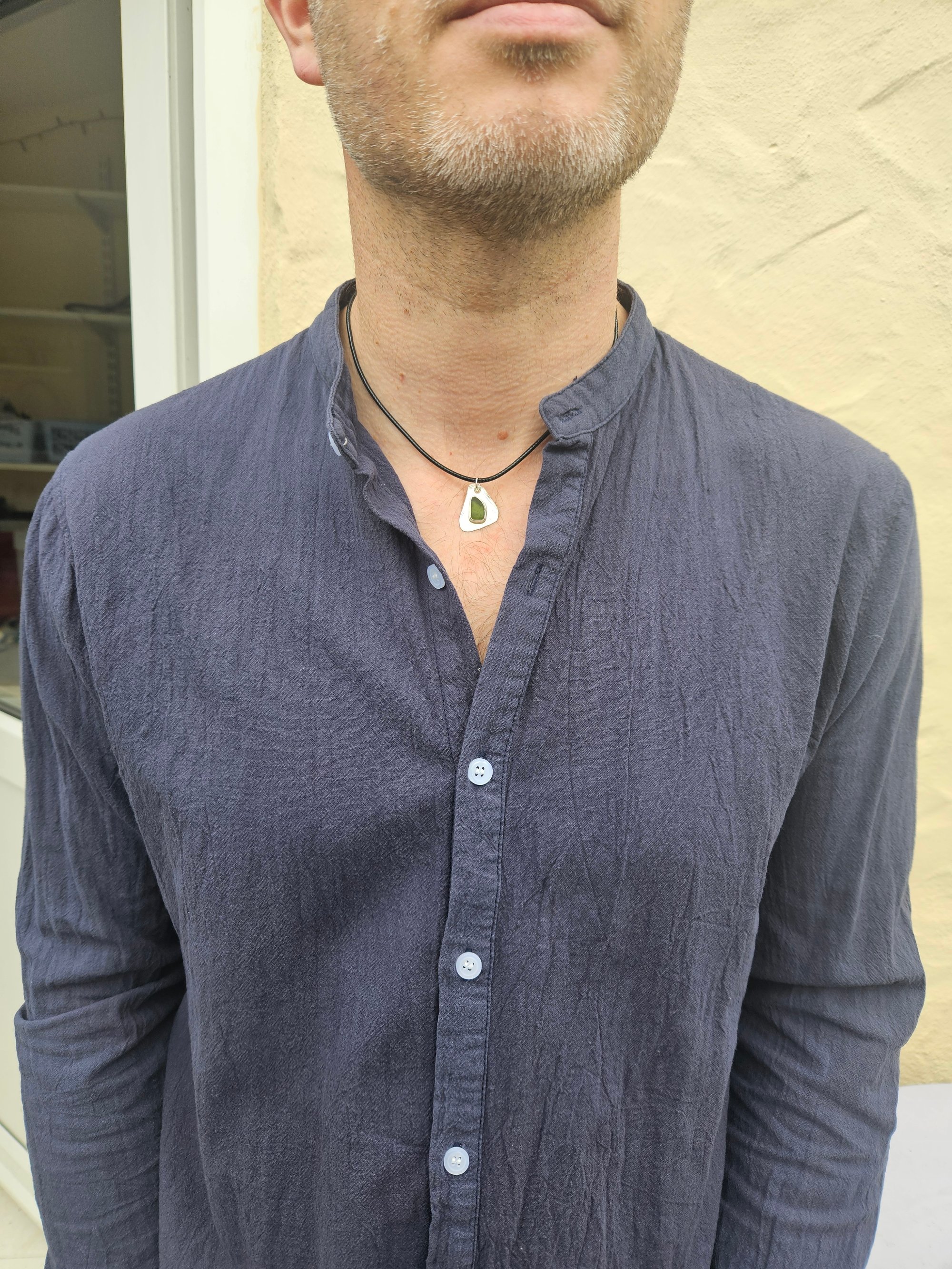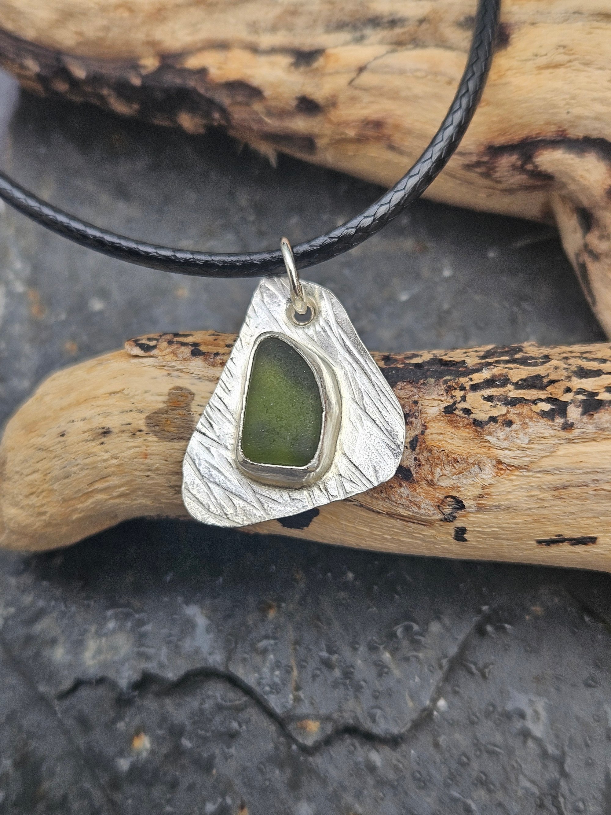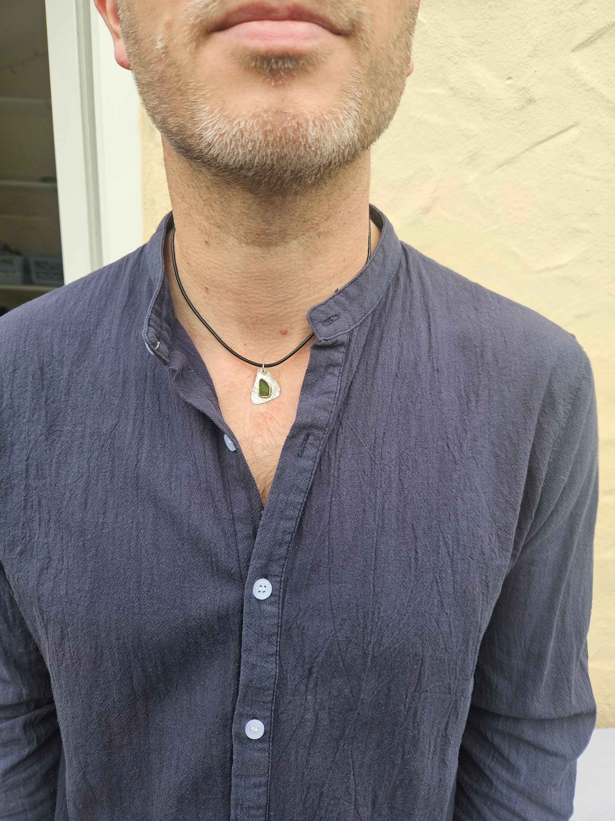 Mens Necklace handmade by me featuring a irregular shaped piece of 0.3mm sterling silver sheet metal thats been hammered in a criss cross pattern for a rustic effect with a bezel set piece of dark green seaglass that I found on a recent beach walk here in Cornwall where I live. One of a kind unique piece.