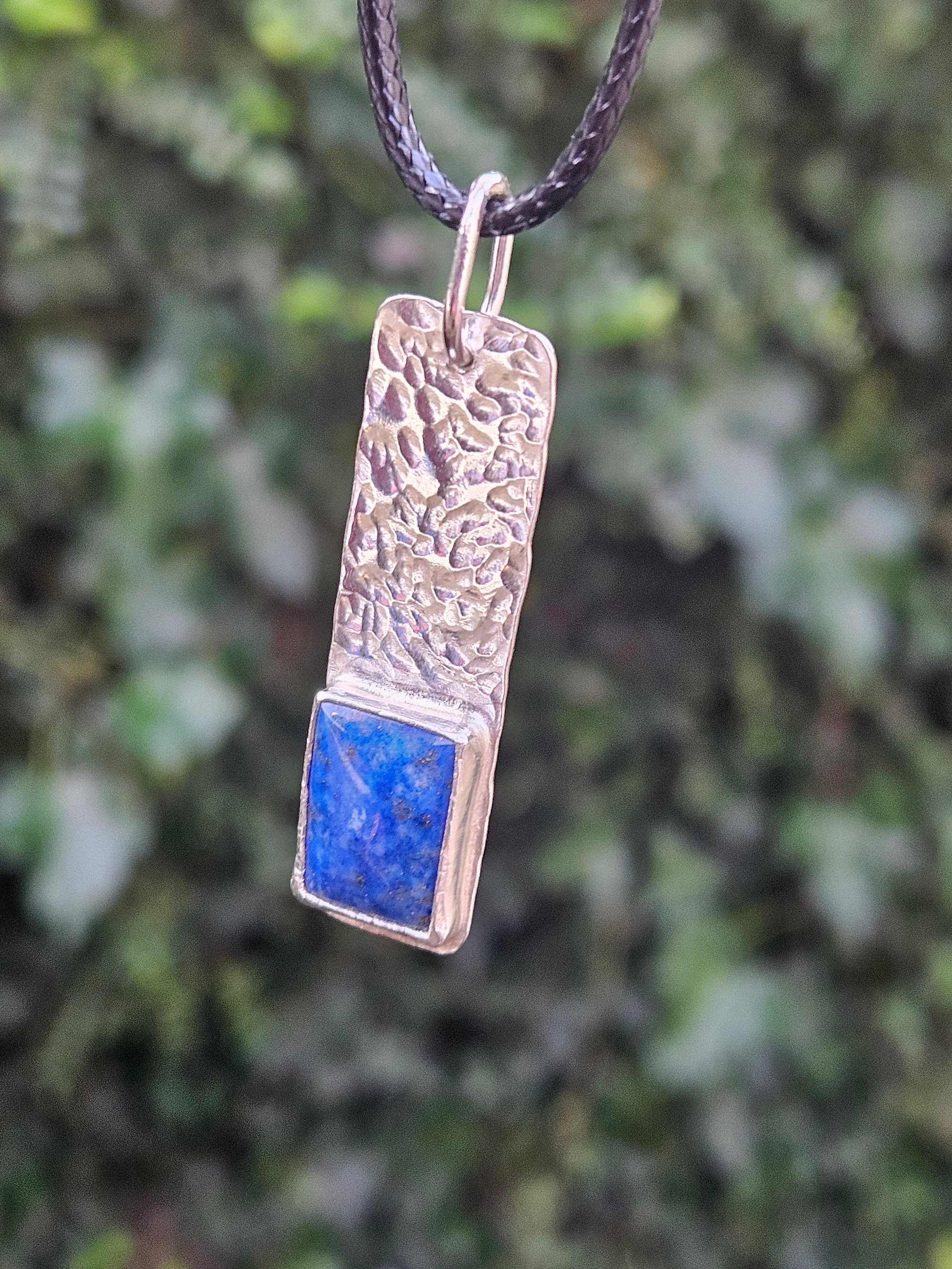 Mens necklace handmade by me featuring a long rectangular piece of sterling silver 0.5mm metal sheet that ive hammered for a lovely dimpled effect. Ive then bezel set a rectangular lovely piece of lapis lazuli gemstone which is dark blue with gold flecks within the stone. A real statement unique piece!