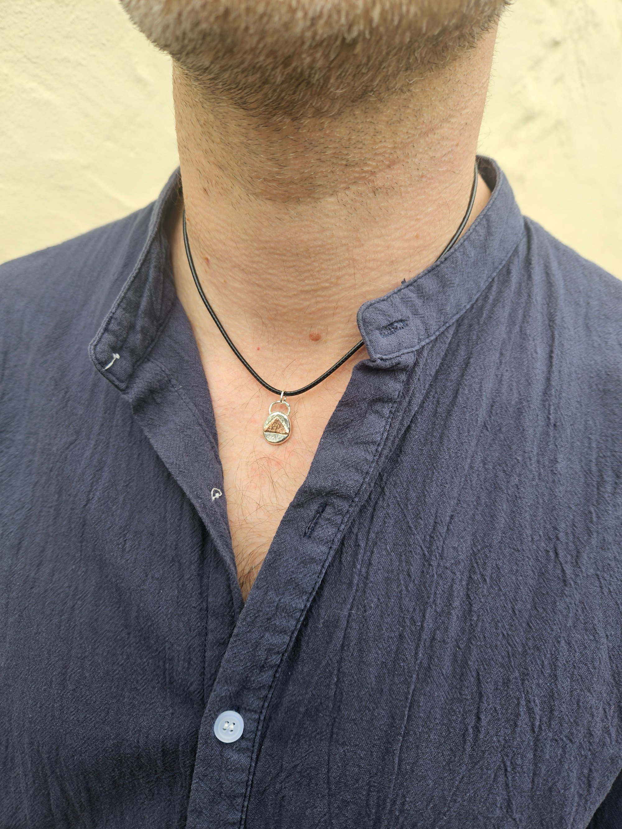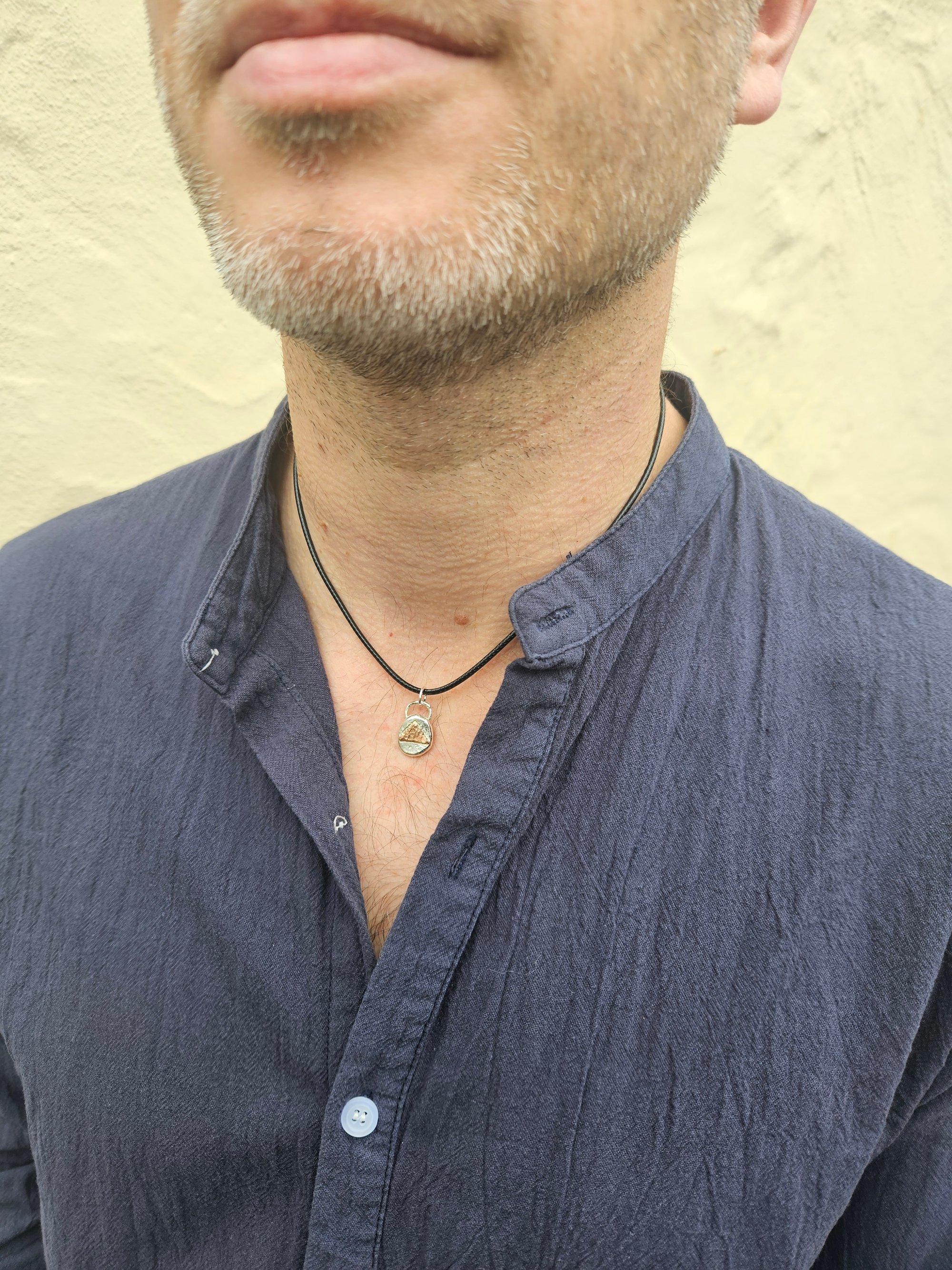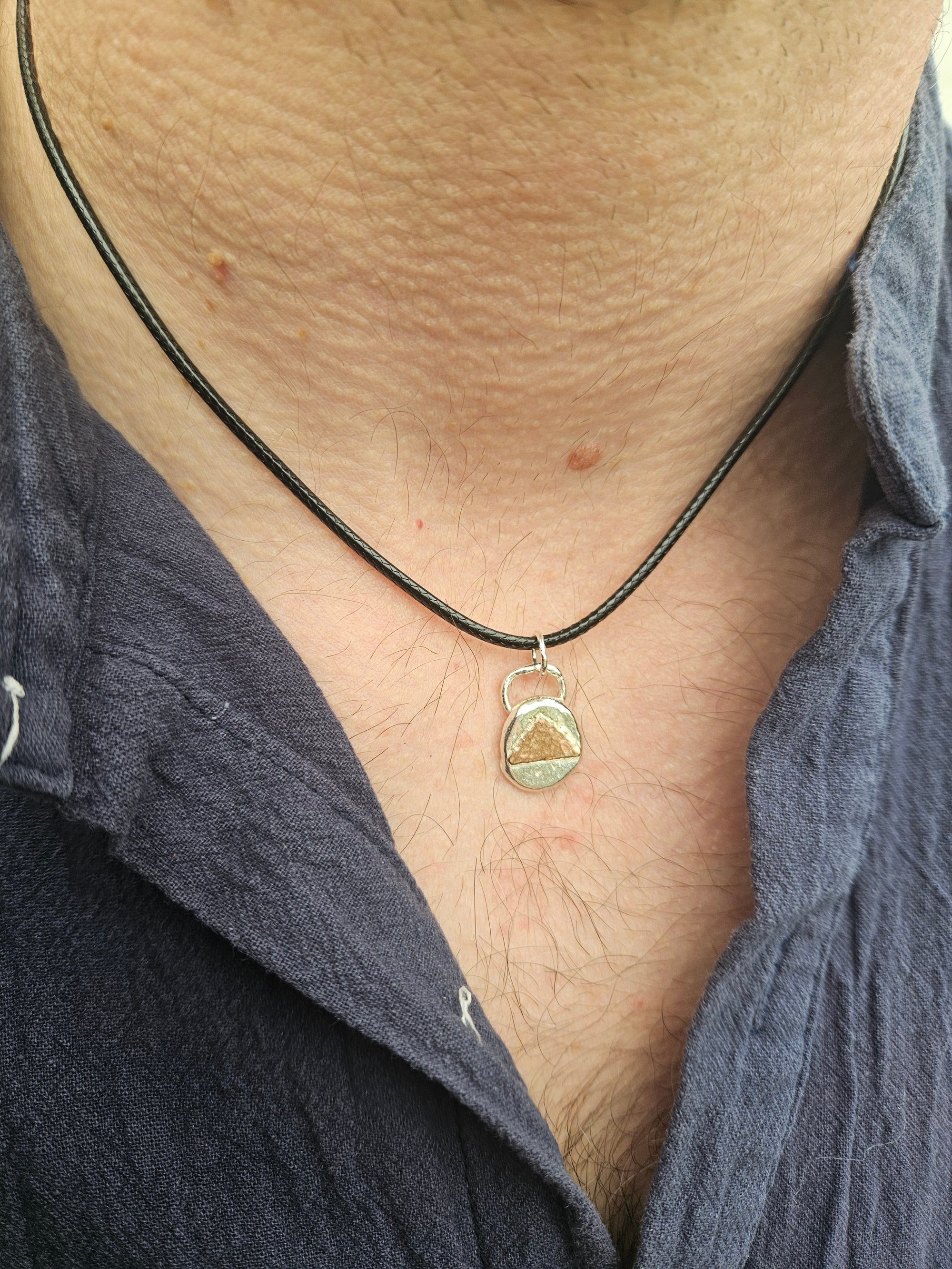 Mens necklace handmade by me featuring a thick melted pebble of recycled sterling silver that ive hammered flatter and added a handcut piece of copper to represent a mountain. ( Please note the copper part will eventually tarnish and darken down to a deep brown copper as all copper does ( if you want to keep the more shiny orange copper look you will need to polish it back to shiny with a soft polishing cloth available from most supermarkets) rustic and cool.