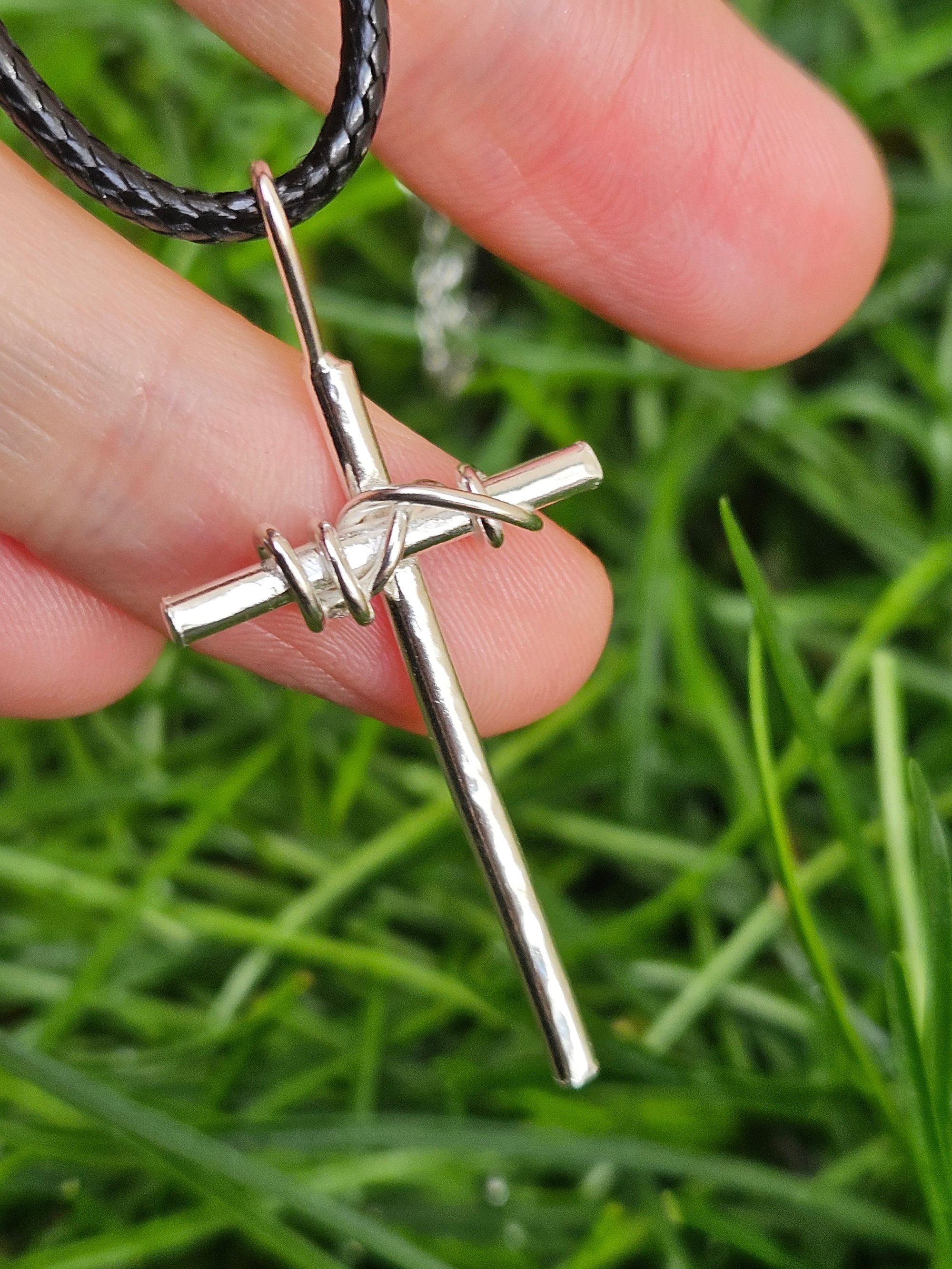 Handmade Sterling silver cross necklace made by me with thick sterling silver ' D' wire and ive added extra sterling silver wire wrapped around it. All soldered together and secure. Approx 5cm long and 3cm wide but all vary slightly.