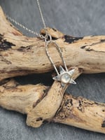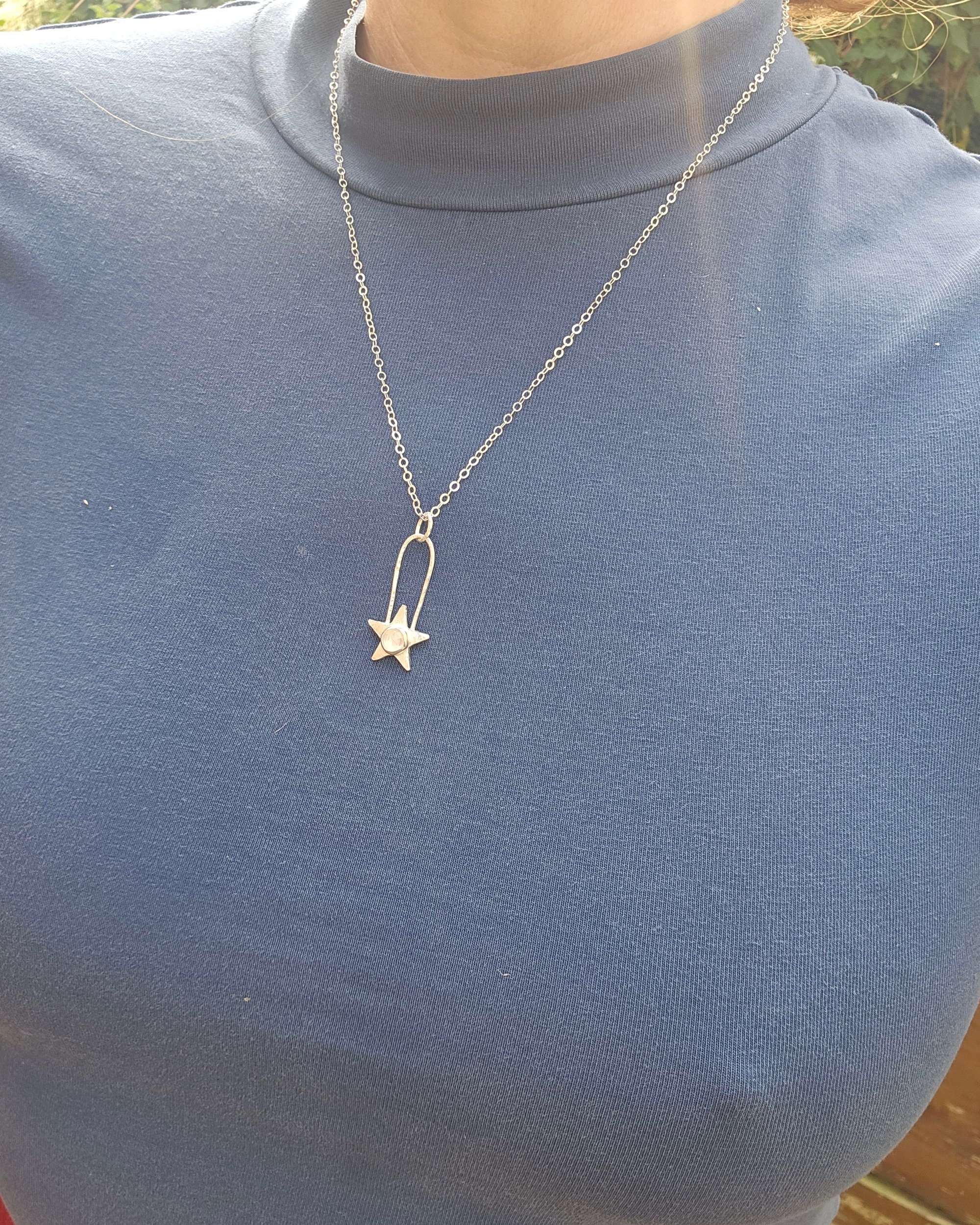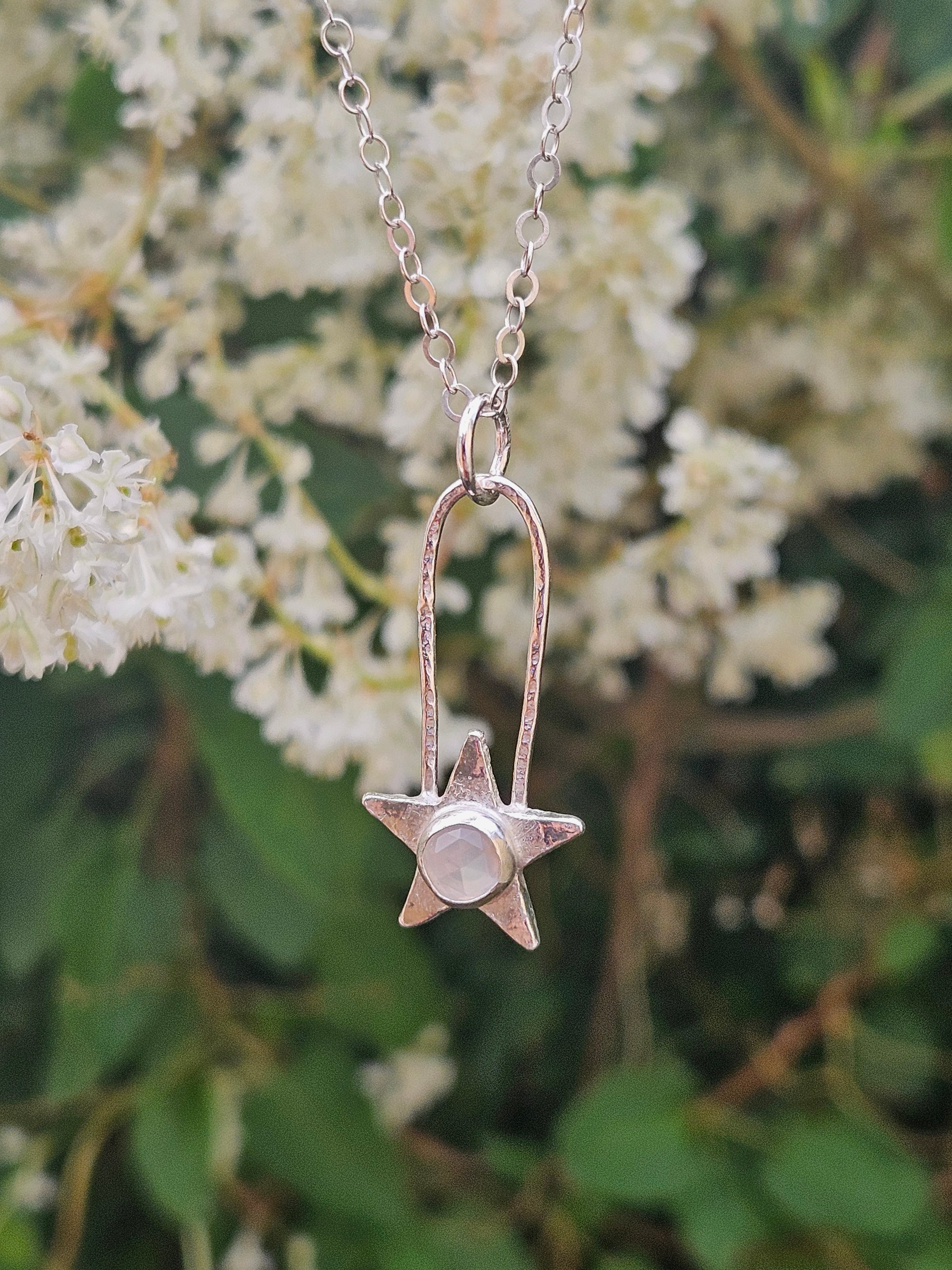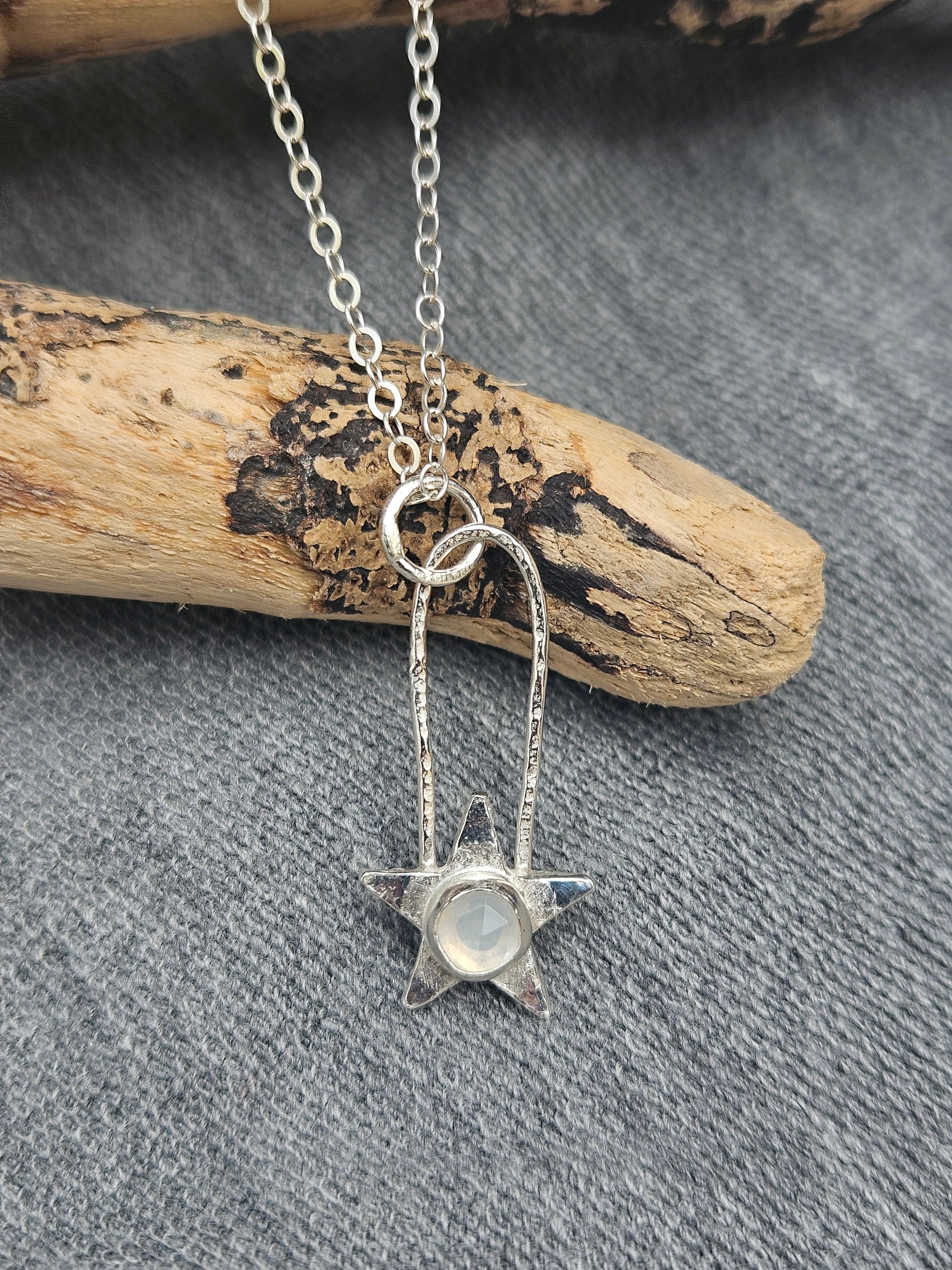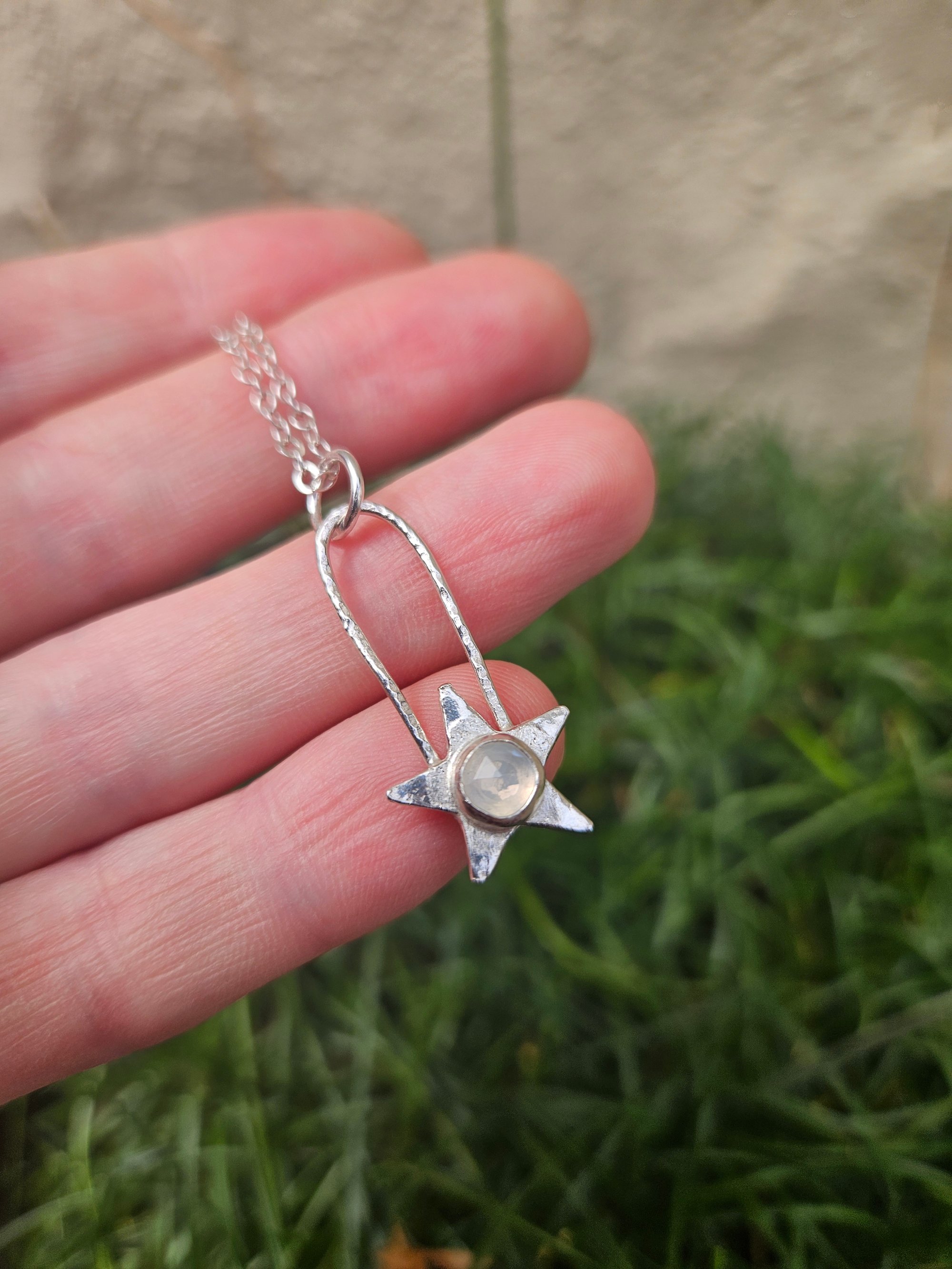A beautiful sterling silver star necklace with moonstone gemstone and a sterling silver wire bail.