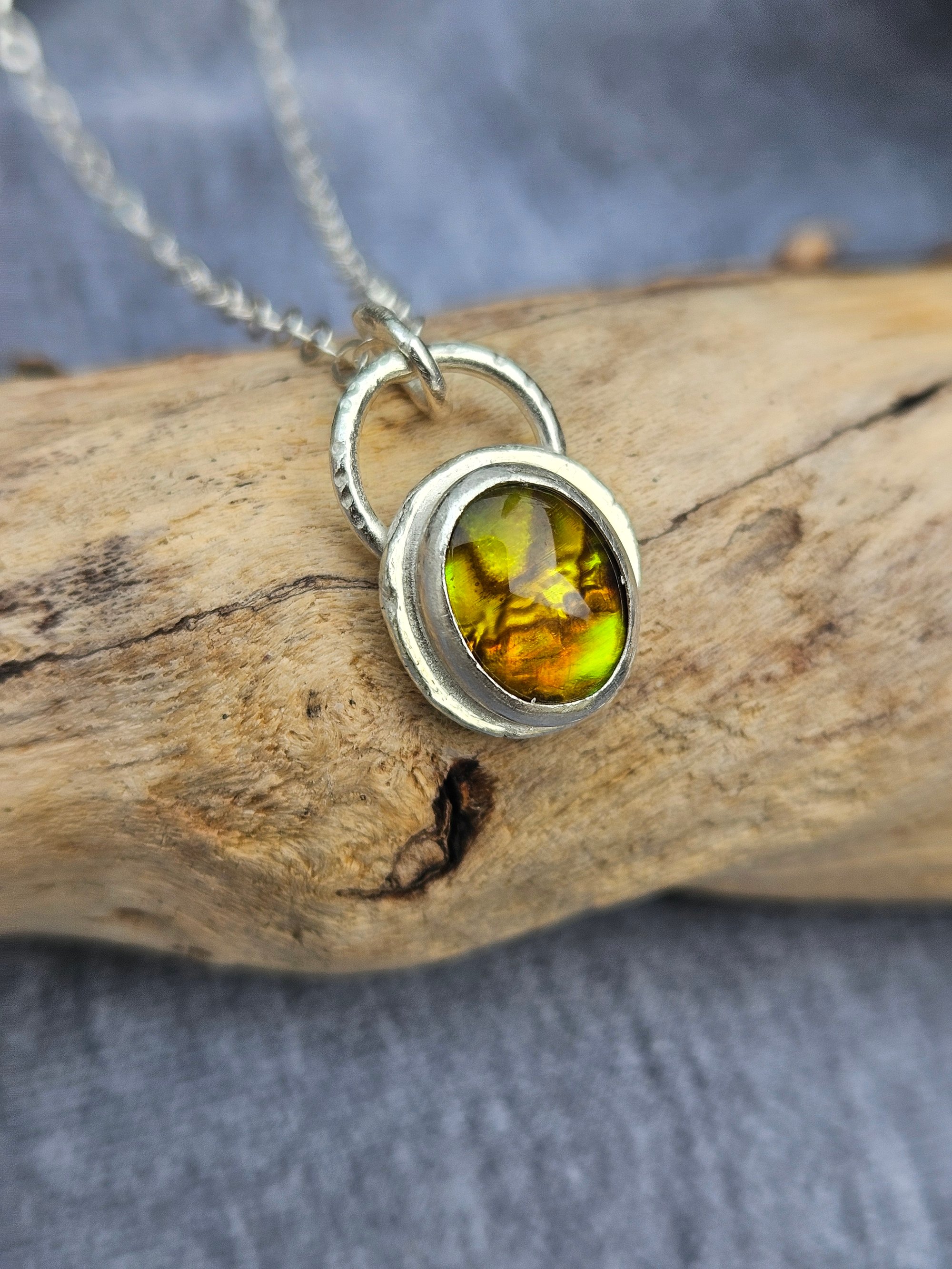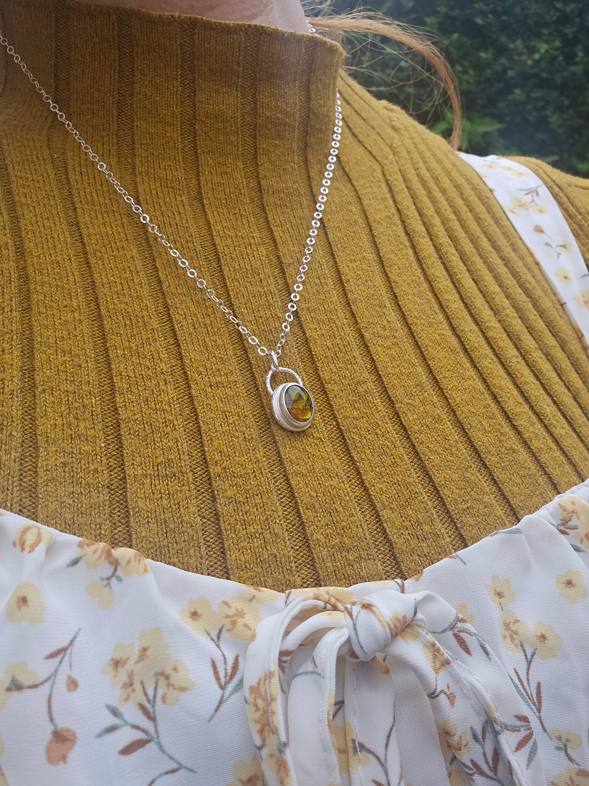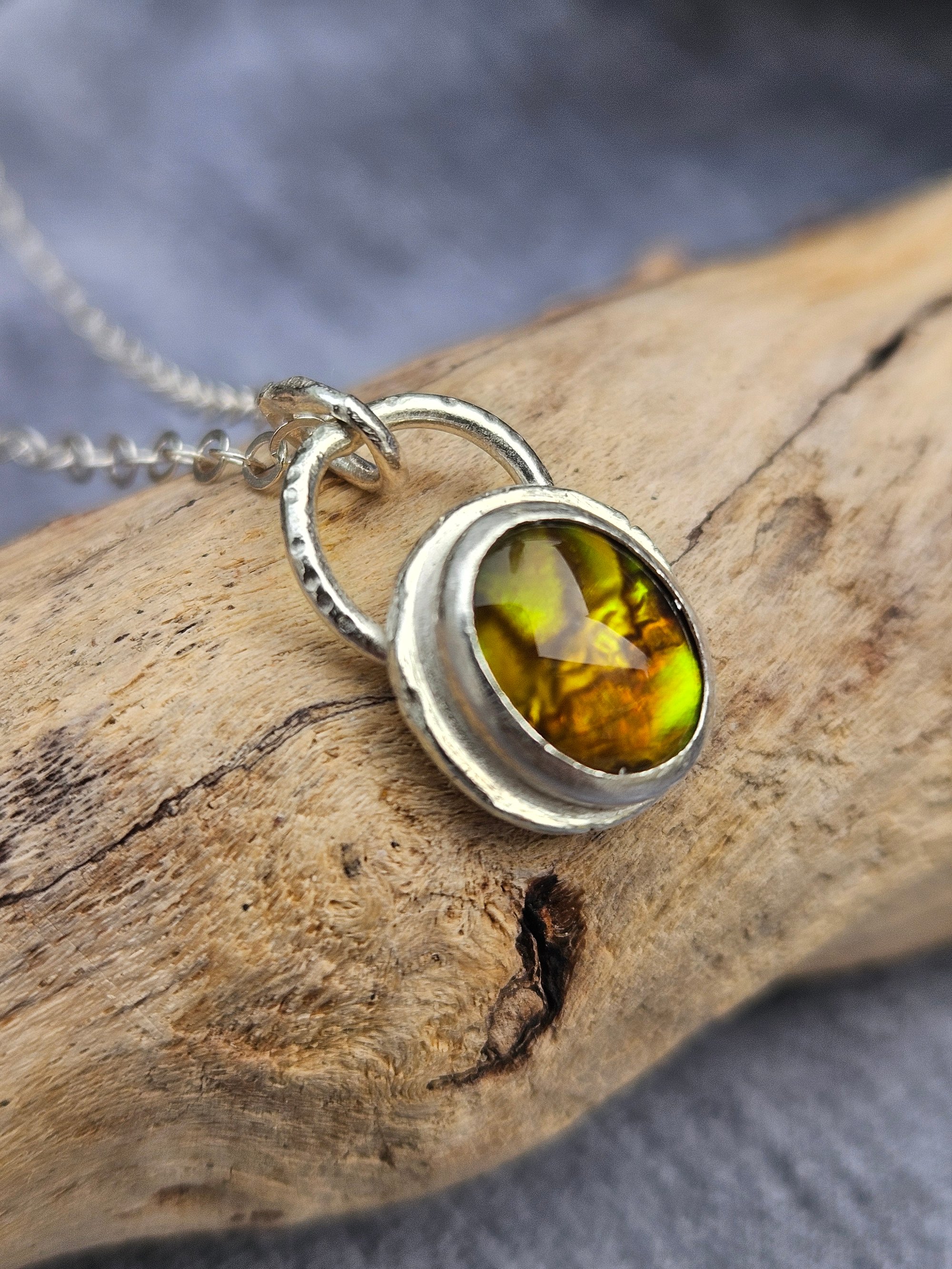 Handmade Sterling silver necklace featuring a bezel set piece of bronze Paua shell sat on top of a hammered recycled sterling silver nugget of silver. Decorative wire bail. Cute pendant one of a kind!