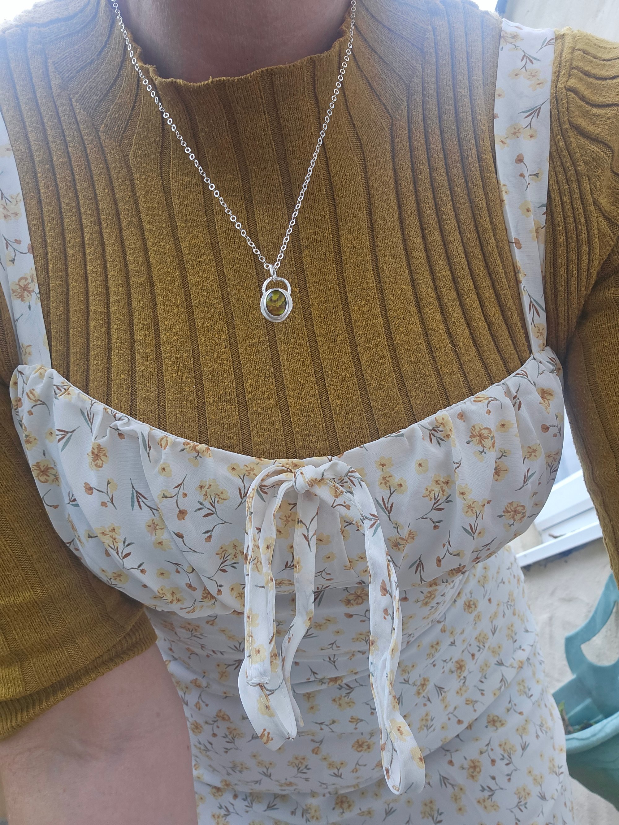 This is on a sterling silver jump ring and sterling silver trace chain ( please leave me a note at checkout letting me know whether you would prefer an 18 inch or 20 inch necklace chain thank you. If i dont hear from you within 24 hrs it will be sent with an 18" chain. )