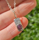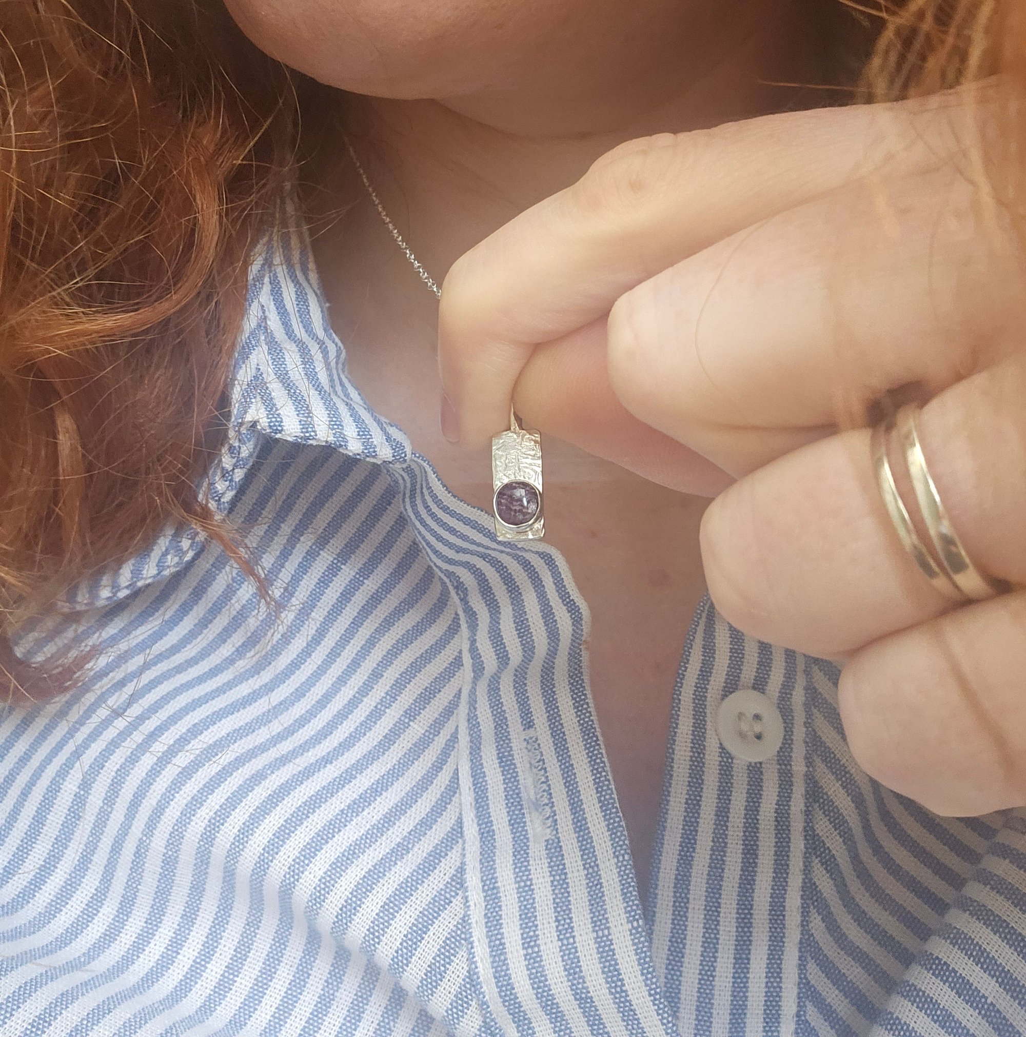 A .925 sterling silver thick piece of wire ive textured with my hammer and then it has a fine silver bezel which has a round agate gemstone set in it which is dark purple with white stripes.