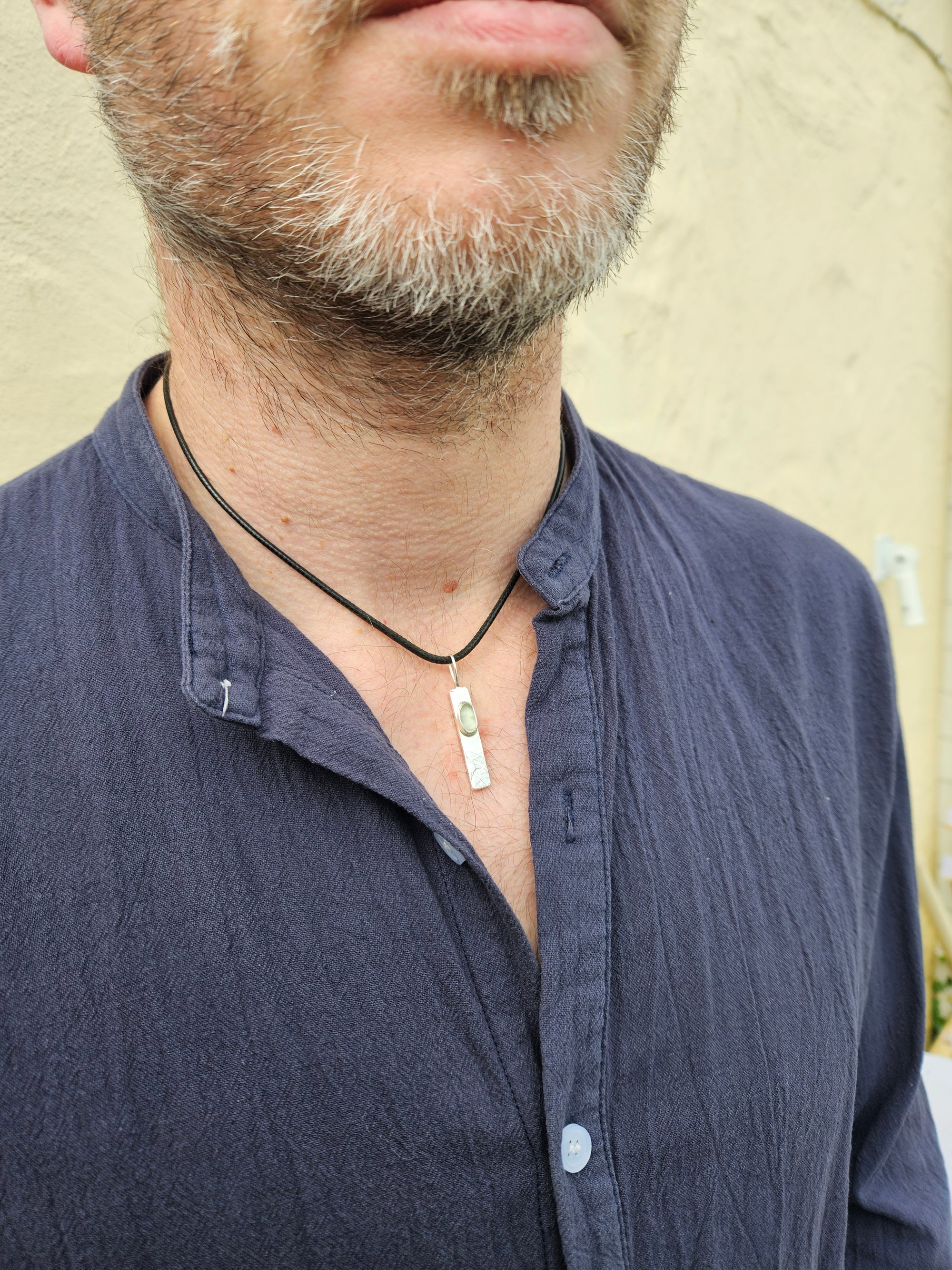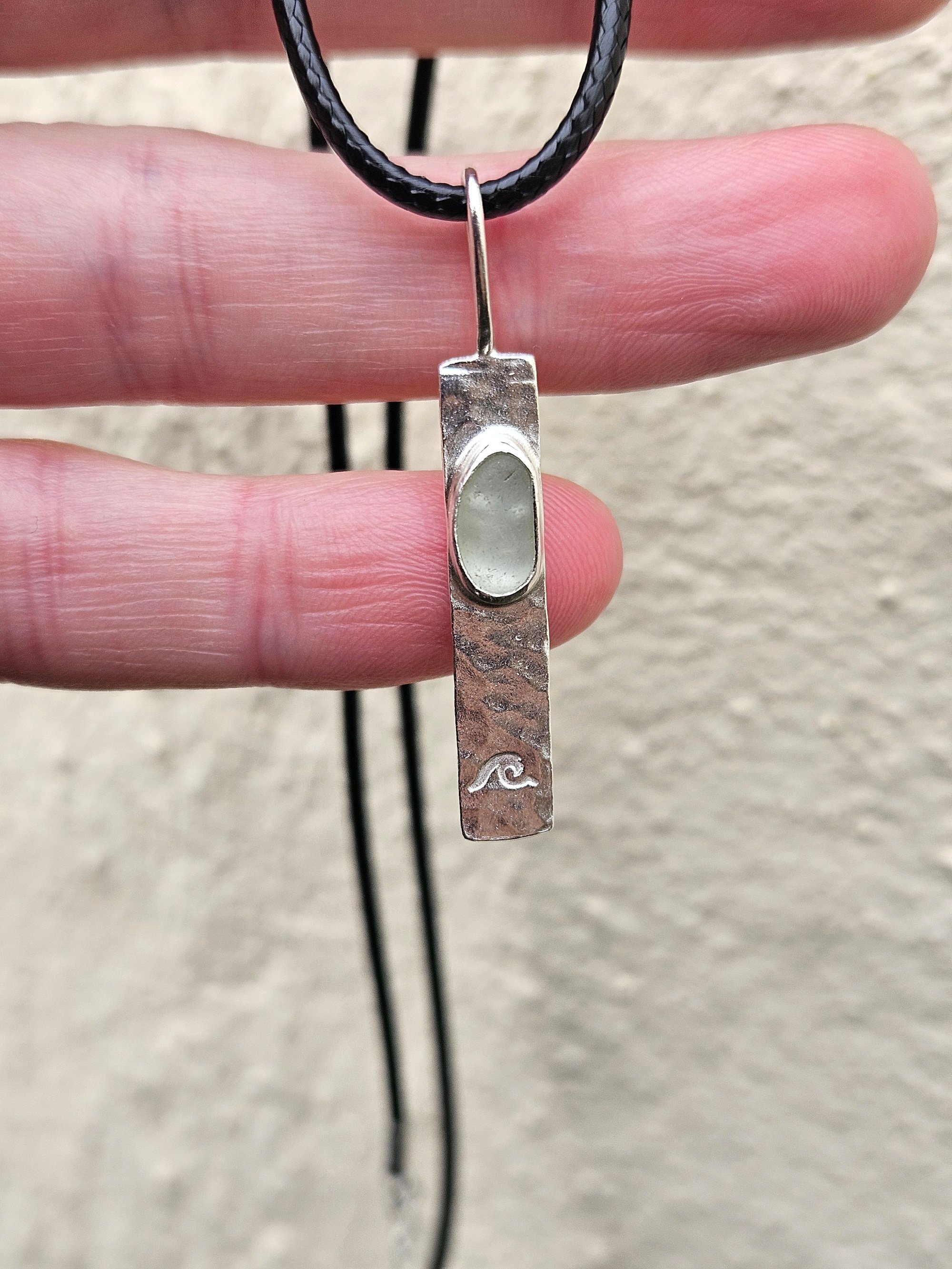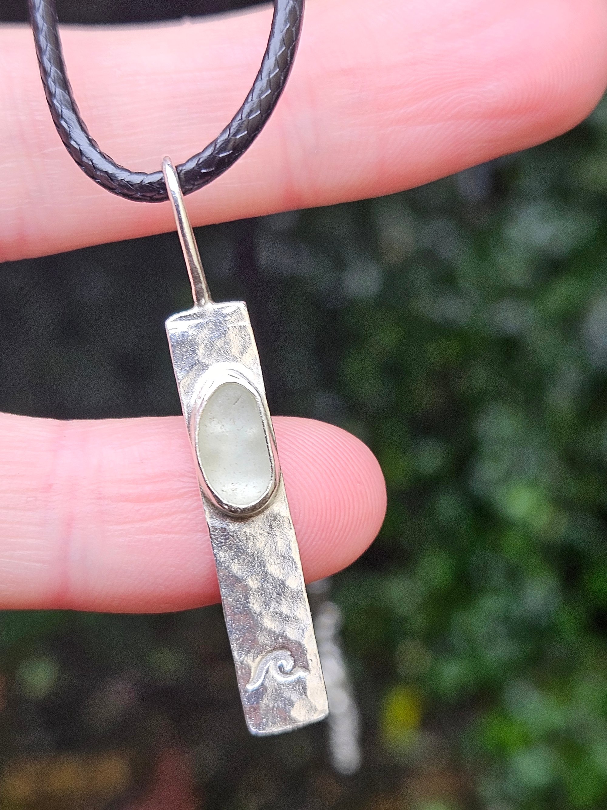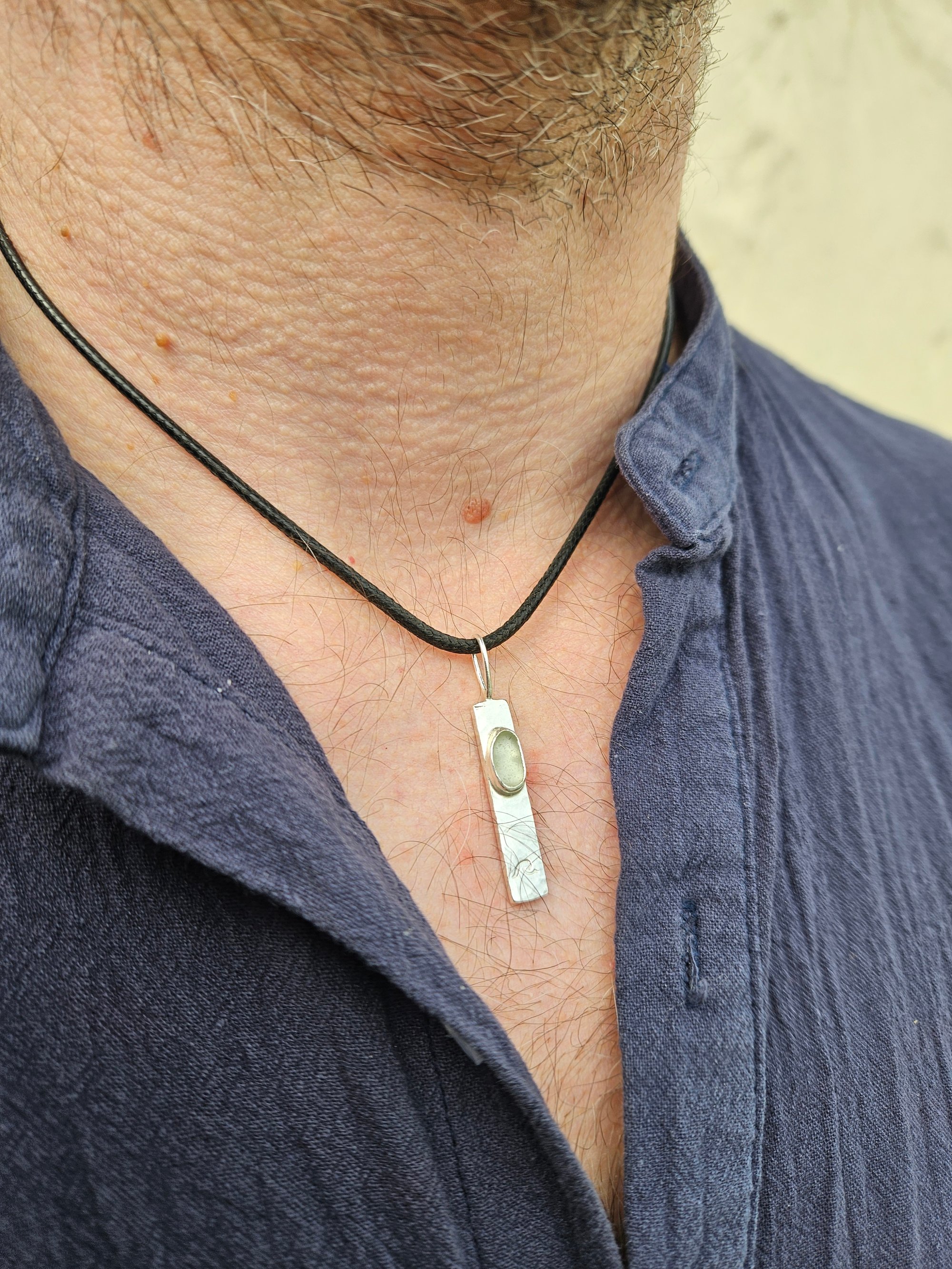 Handmade Sterling silver mens necklace. Thick rectangular sterling silver wire approx 3cm long , 0.5cm wide and 3mm thick. Ive hammered this for a dimpled texture and added a piece of white seaglass that i found on a recent beach walk here in Cornwall. Ive bezel set the seaglass in sterling silver, handstamped it with a wave and added a handmade wire bail. One off and unique.