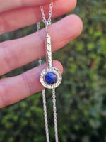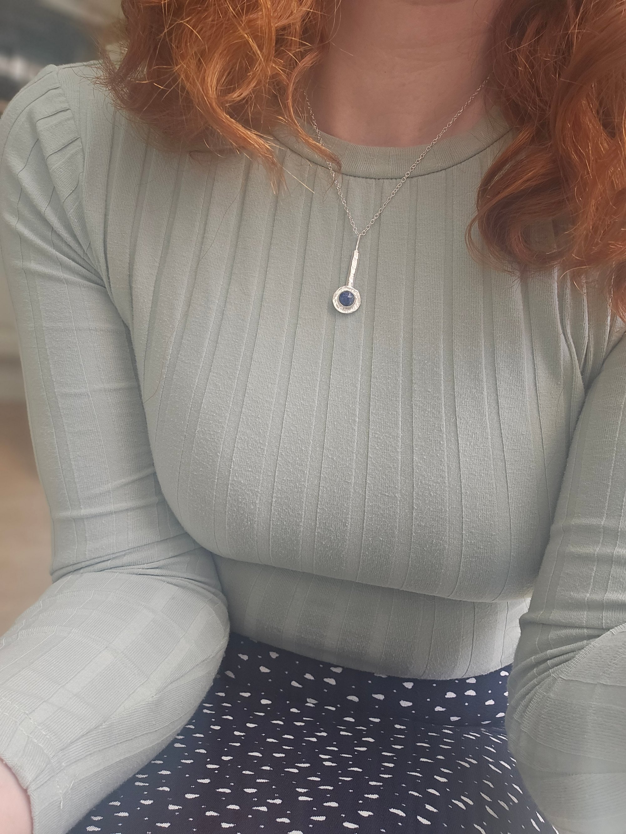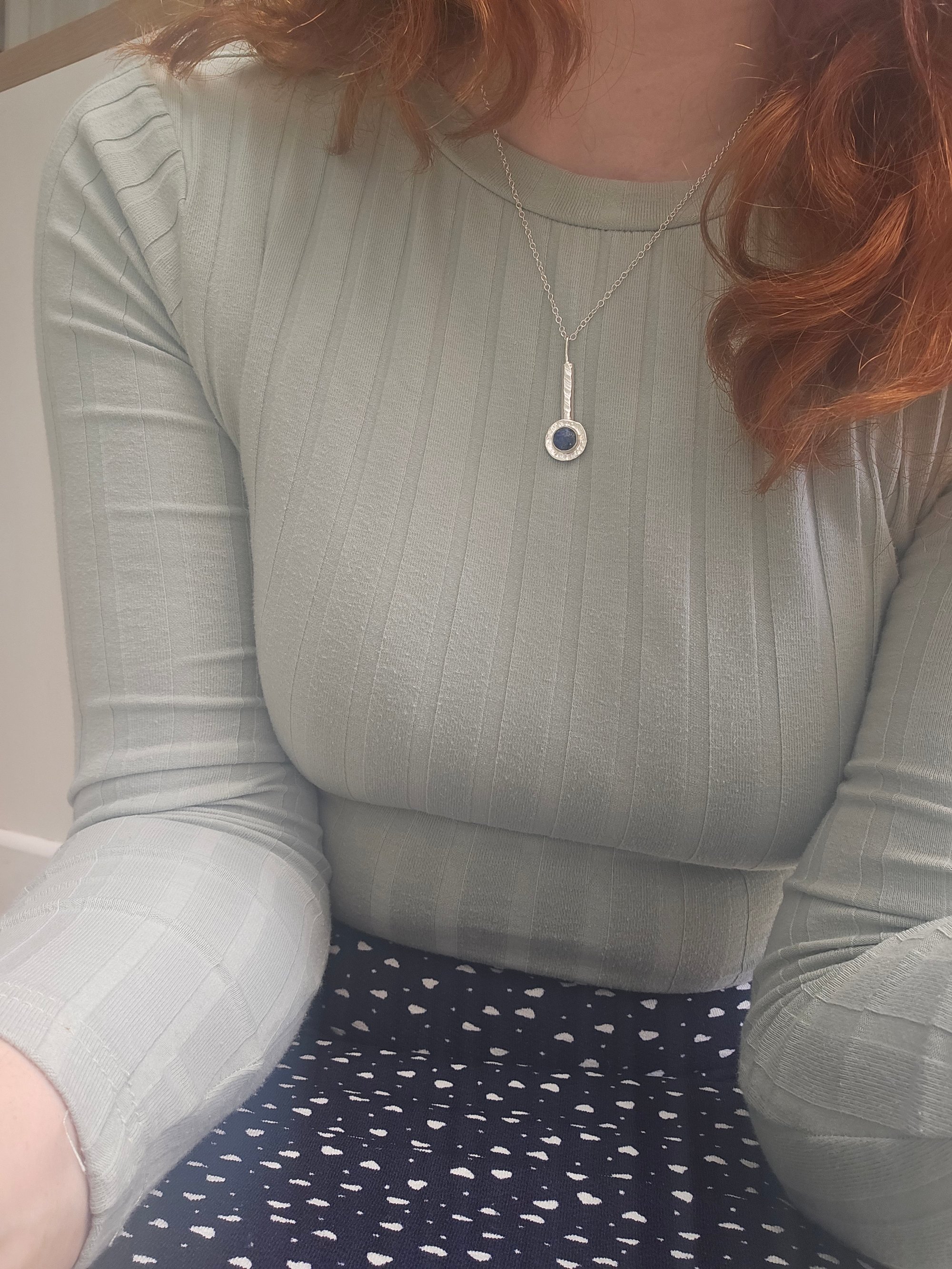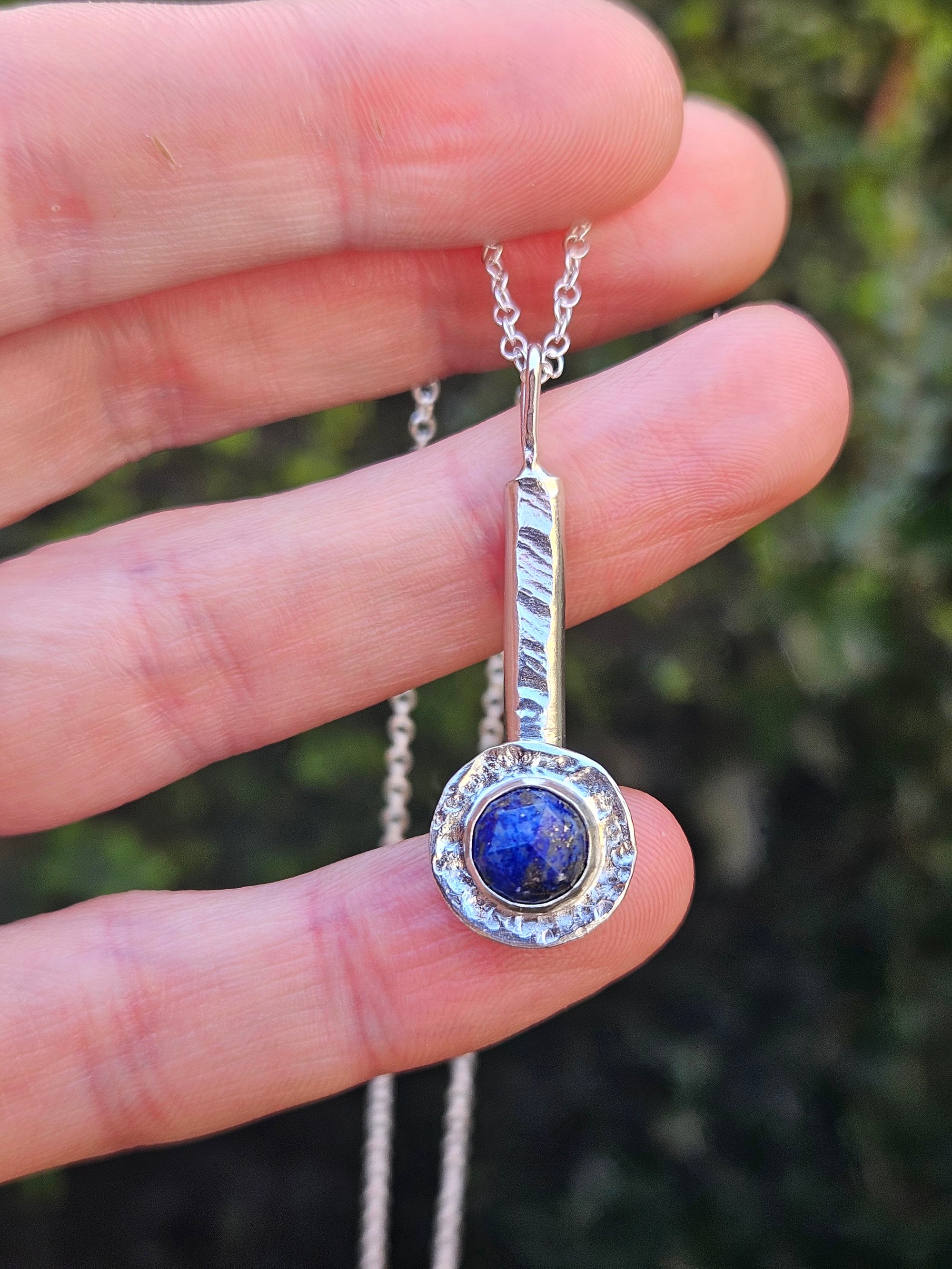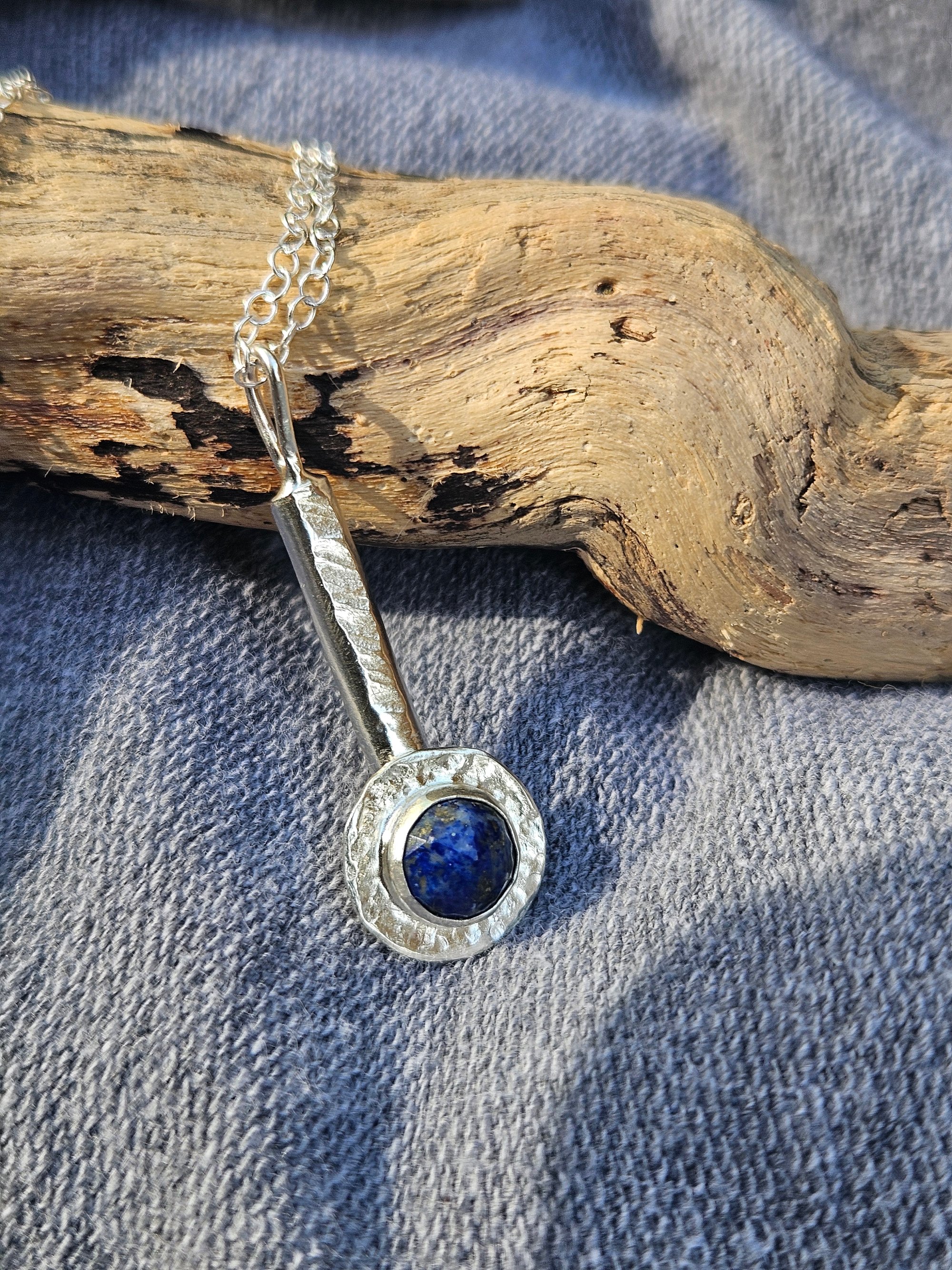 A beautiful blue lapis lazuli gemstone round gemstone cabochon which has gold flecks within , set into a sterling silver bezel setting on a recycled sterling silver round backplate with texture. This is on a thick sterling silver 'D' piece of wire which ive textured with my hammer and has a sterling silver round wire side bail. One of a kind.