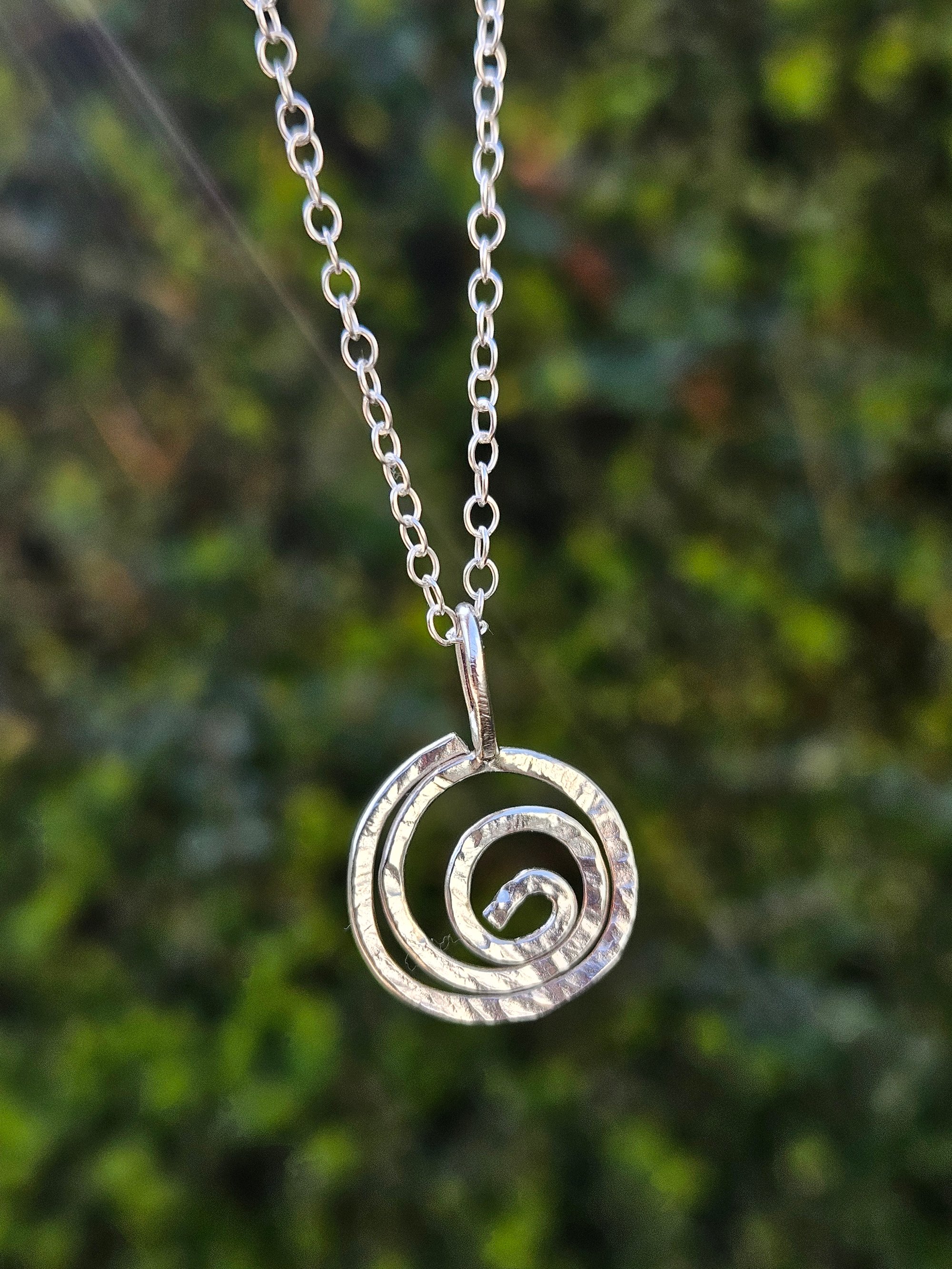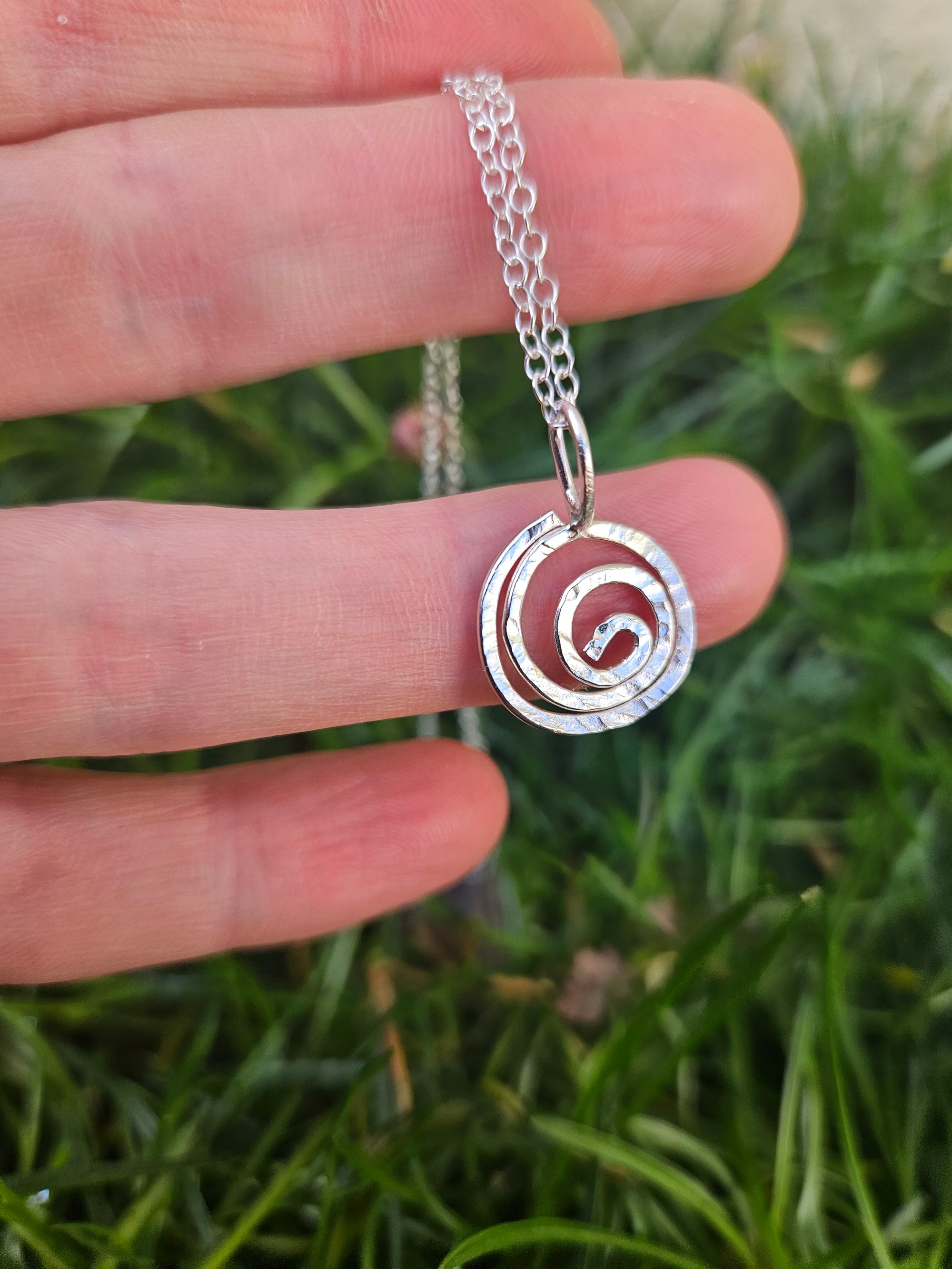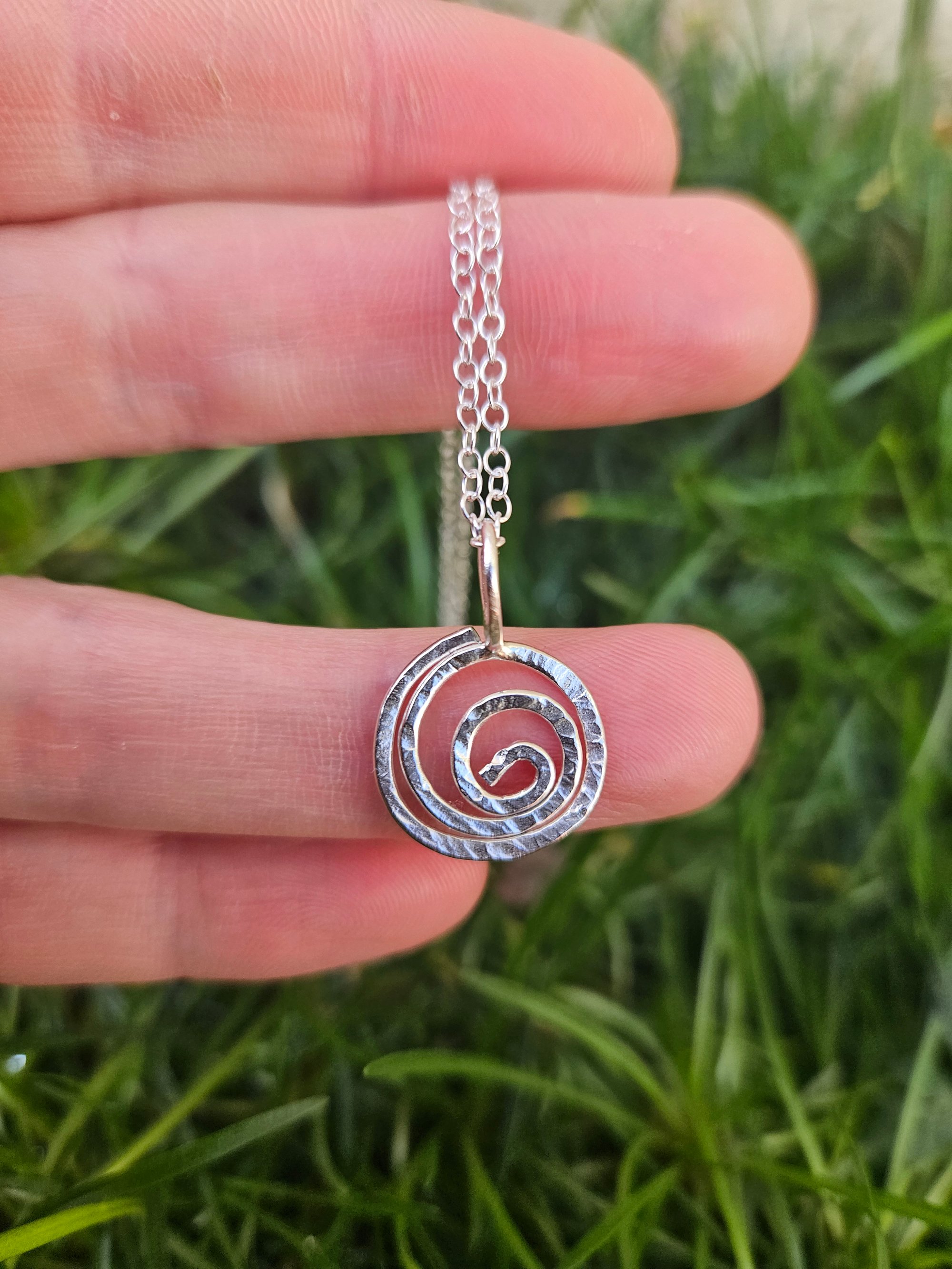 A beautiful handmade sterling silver hammered wire swirl pendant.