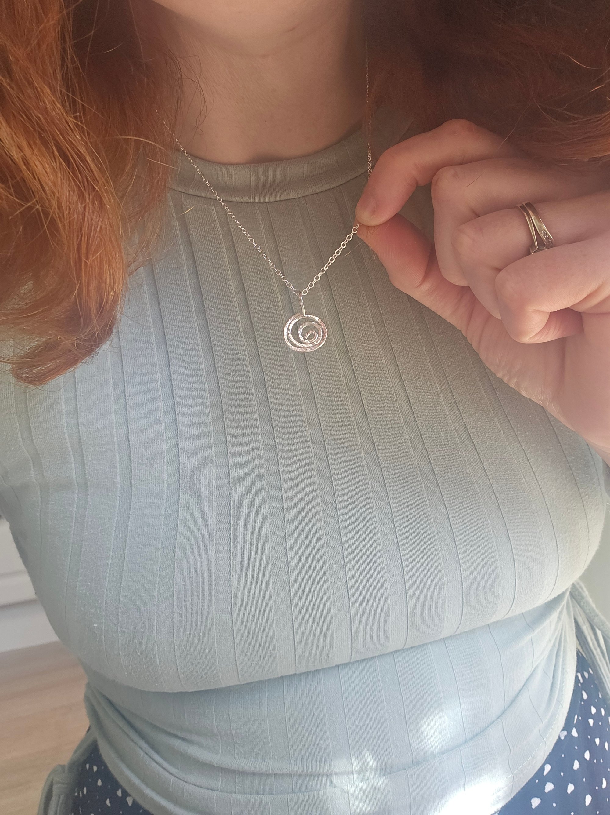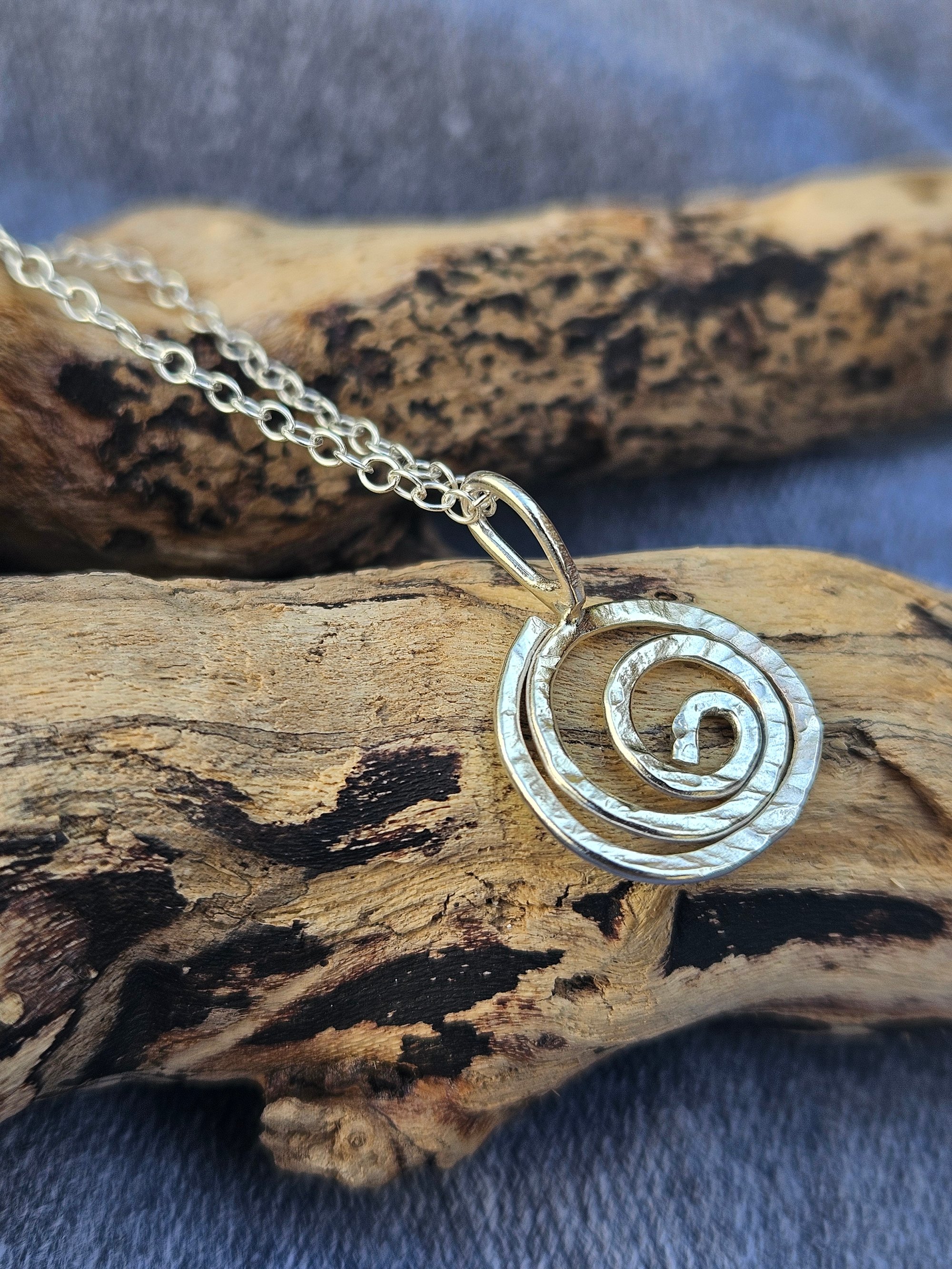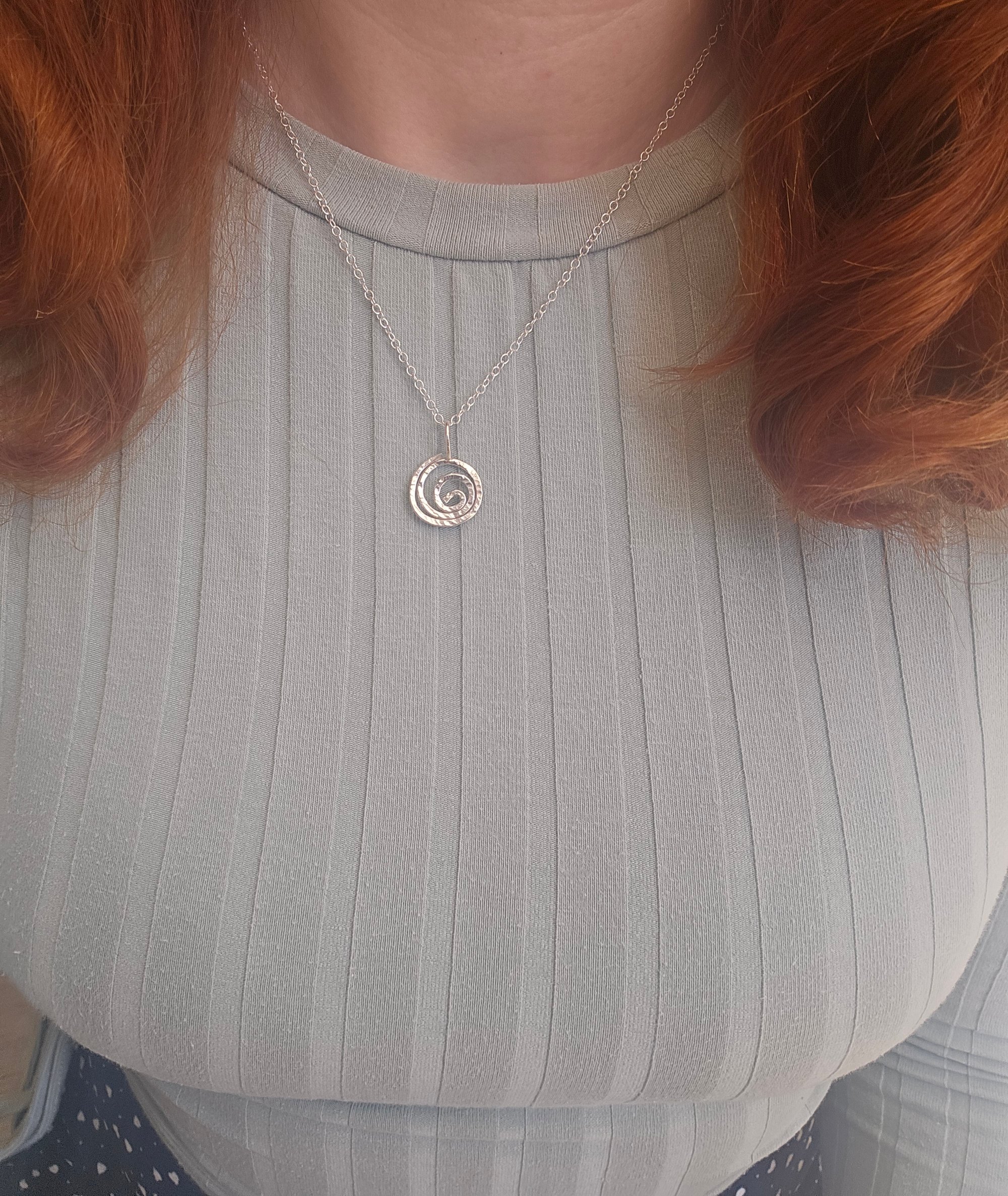 A beautiful handmade sterling silver hammered wire swirl pendant.