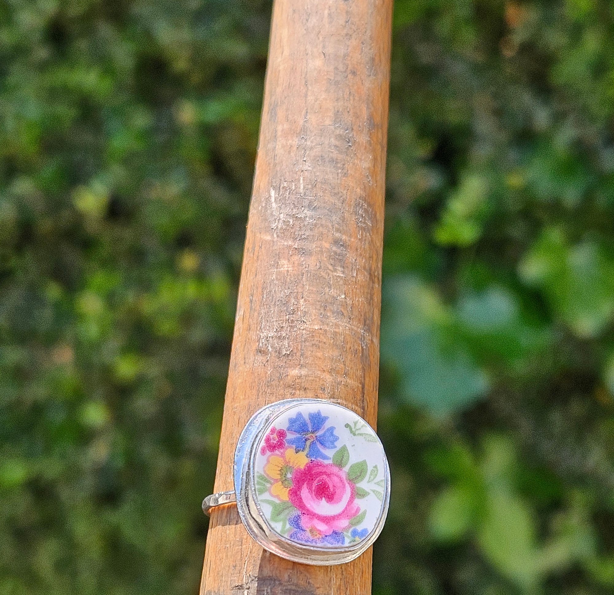 A sterling silver ring with bezel set vintage rose print piece of china. UK ring size R.