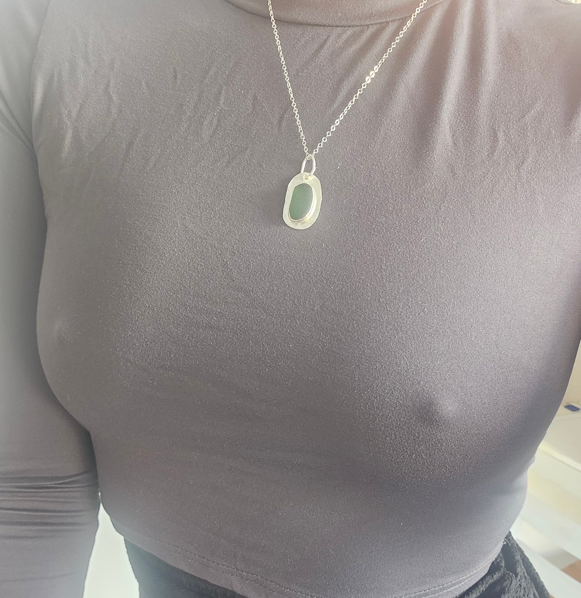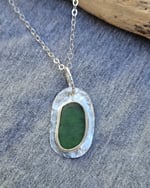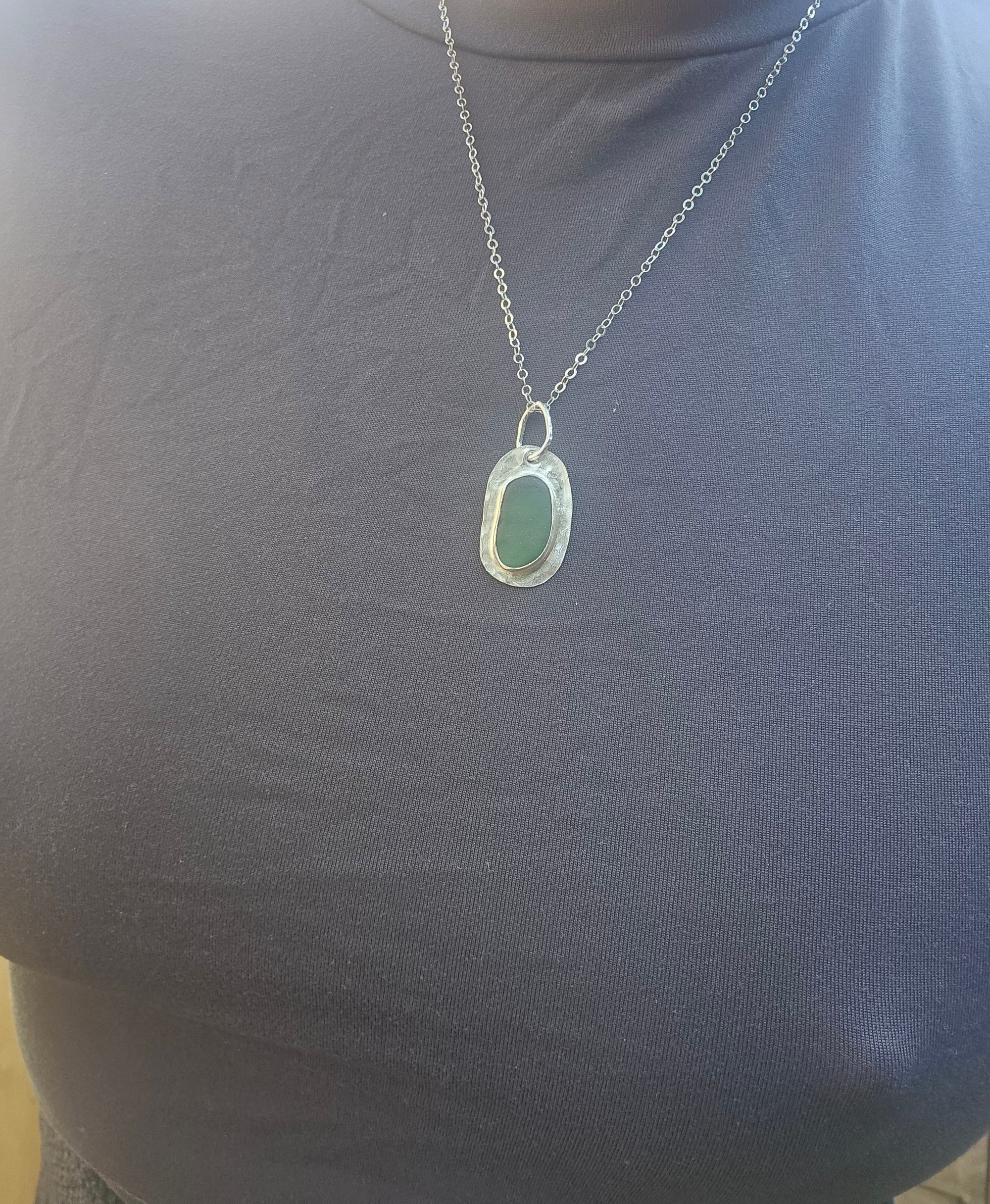 Handmade Sterling silver necklace featuring a dark forest green seaglass piece which I found on a local beach walk here in Cornwall. Ive bezel set it into sterling silver and kept the background fairly simple with a hammered effect. It has a handmade wire jump ring with detailing on.