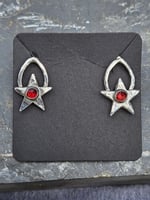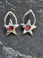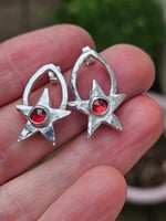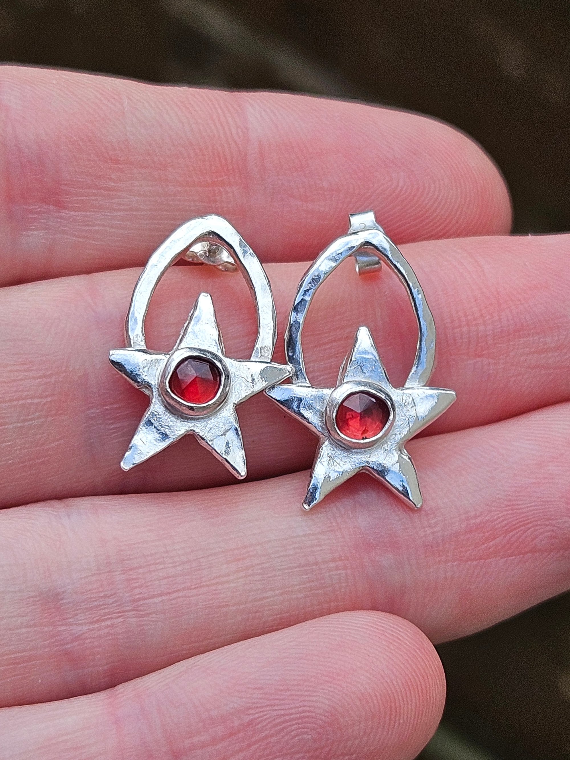 Handmade Sterling silver studs featuring handmade stars made from silver clay and then ive made peardrop shapes out of thick sterling silver wire for the stars to sit on. The wire is hammered to give a lovely dimpled shiny effect. Ive bezel set 5mm rose cut red garnet gemstones into silver on top of the stars. They have sterling silver posts and backs. Please note each star is slightly different in shape size and thickness as when i made them i never intended them to be earrings so they dont match. Think of them as sisters not twins! But very pretty and perfectly imperfect.