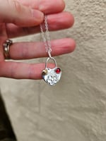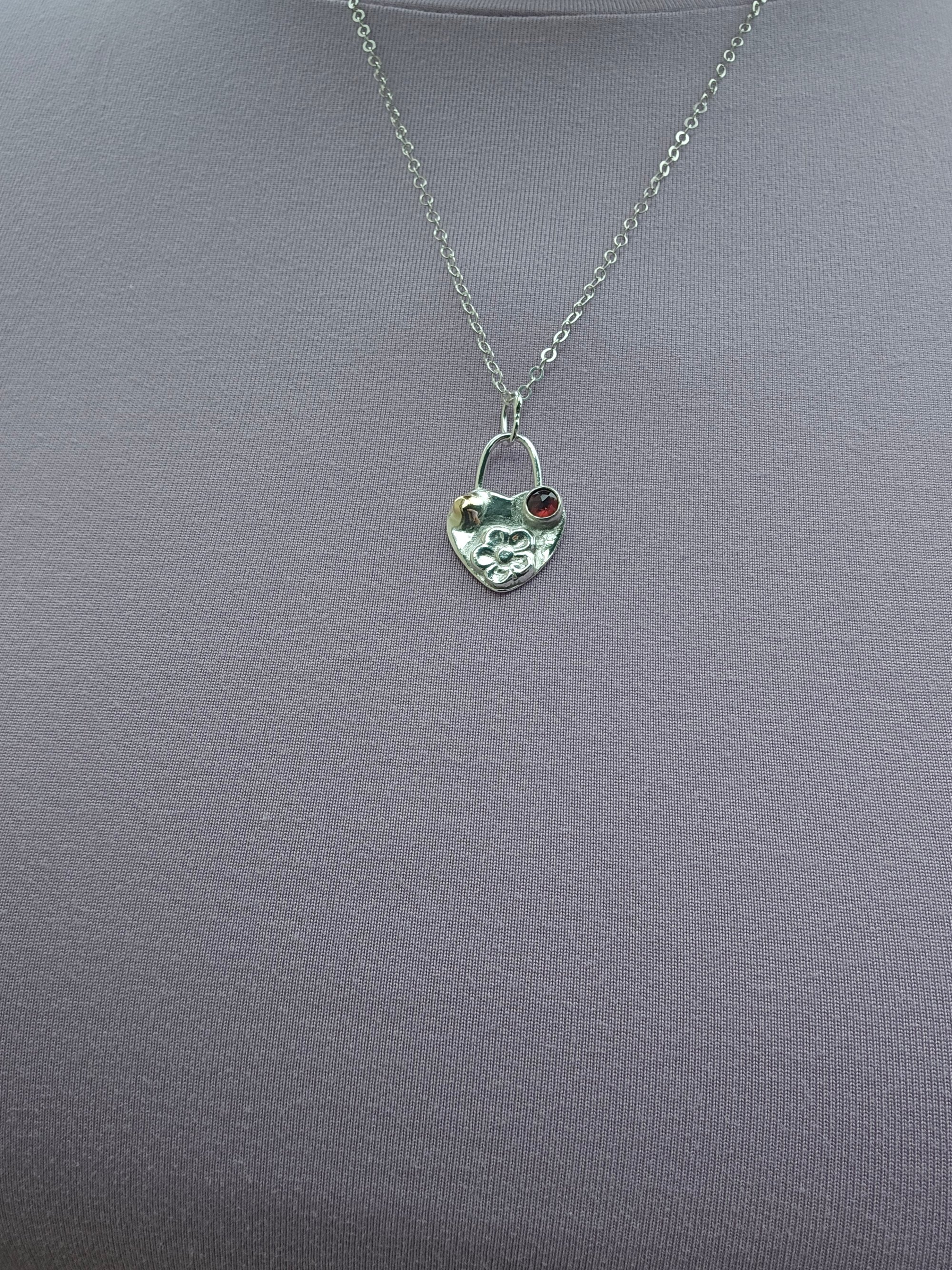 Handmade Sterling silver necklace featuring a handmade silver clay heart and flower ive then added a wire bail , a rose cut dark red garnet set into a sterling silver bezel and a small pebble of melted 9ct gold. Very pretty and dainty would make a superb gift especially for a special occasion.