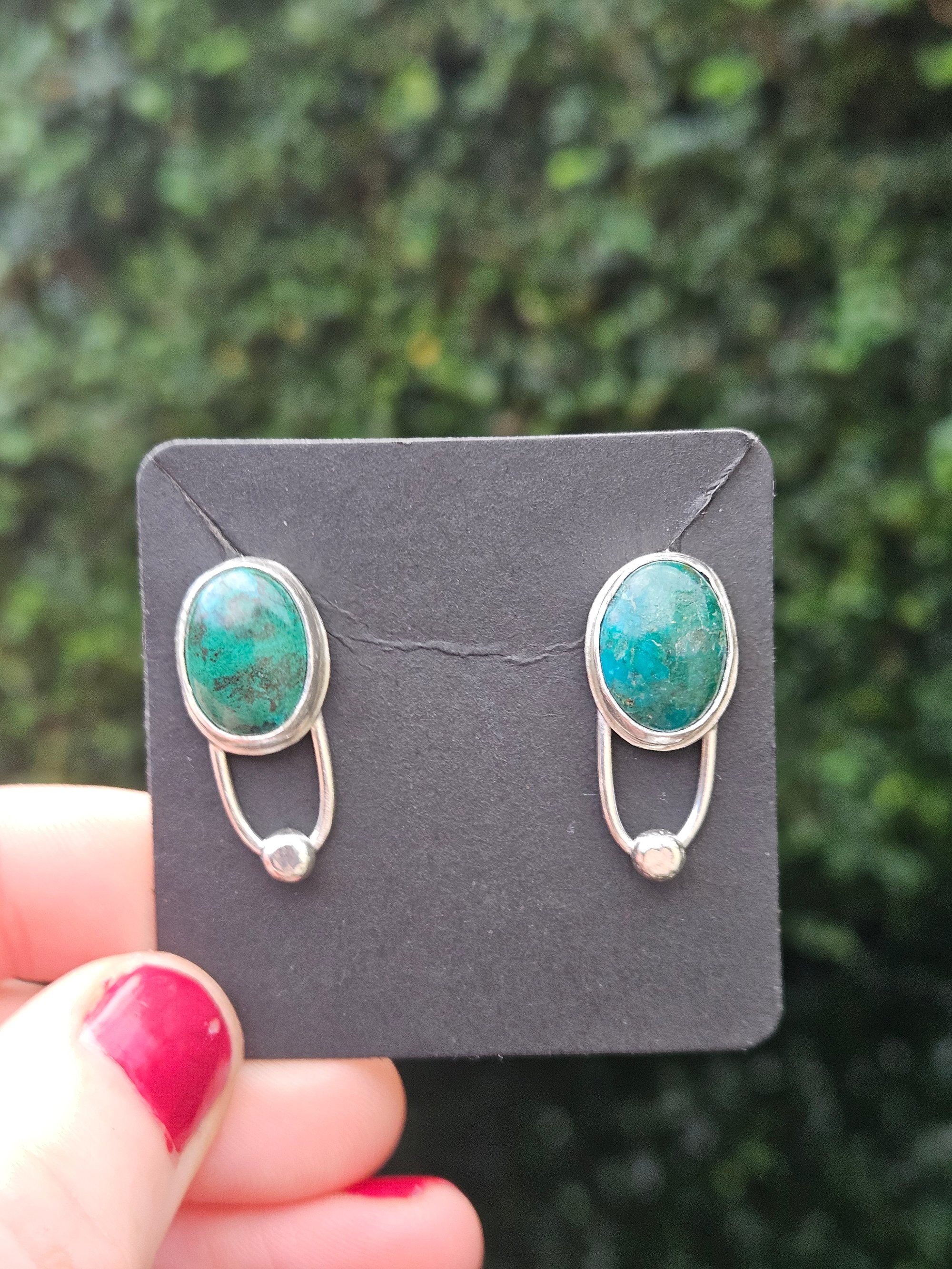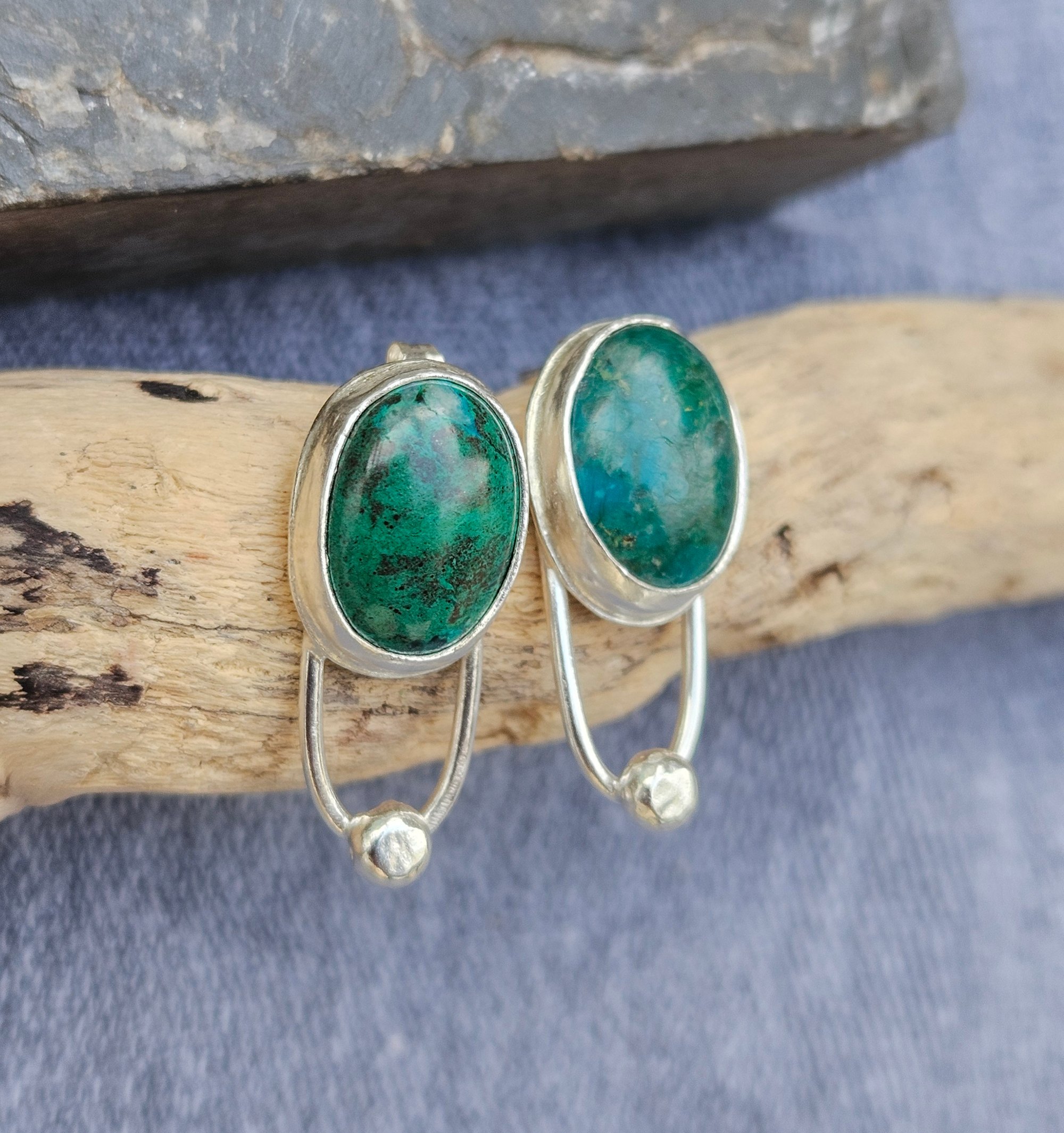 On sale! Sterling Silver stud earrings with bezel set chrysocolla gemstones. These would have been £80 but have some flaws so selling at half price. The bezel wire on right hand side of one is lower than the rest also some marks , scratches and dents on the side so certainly not perfect but very pretty on still.