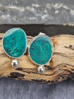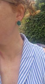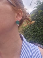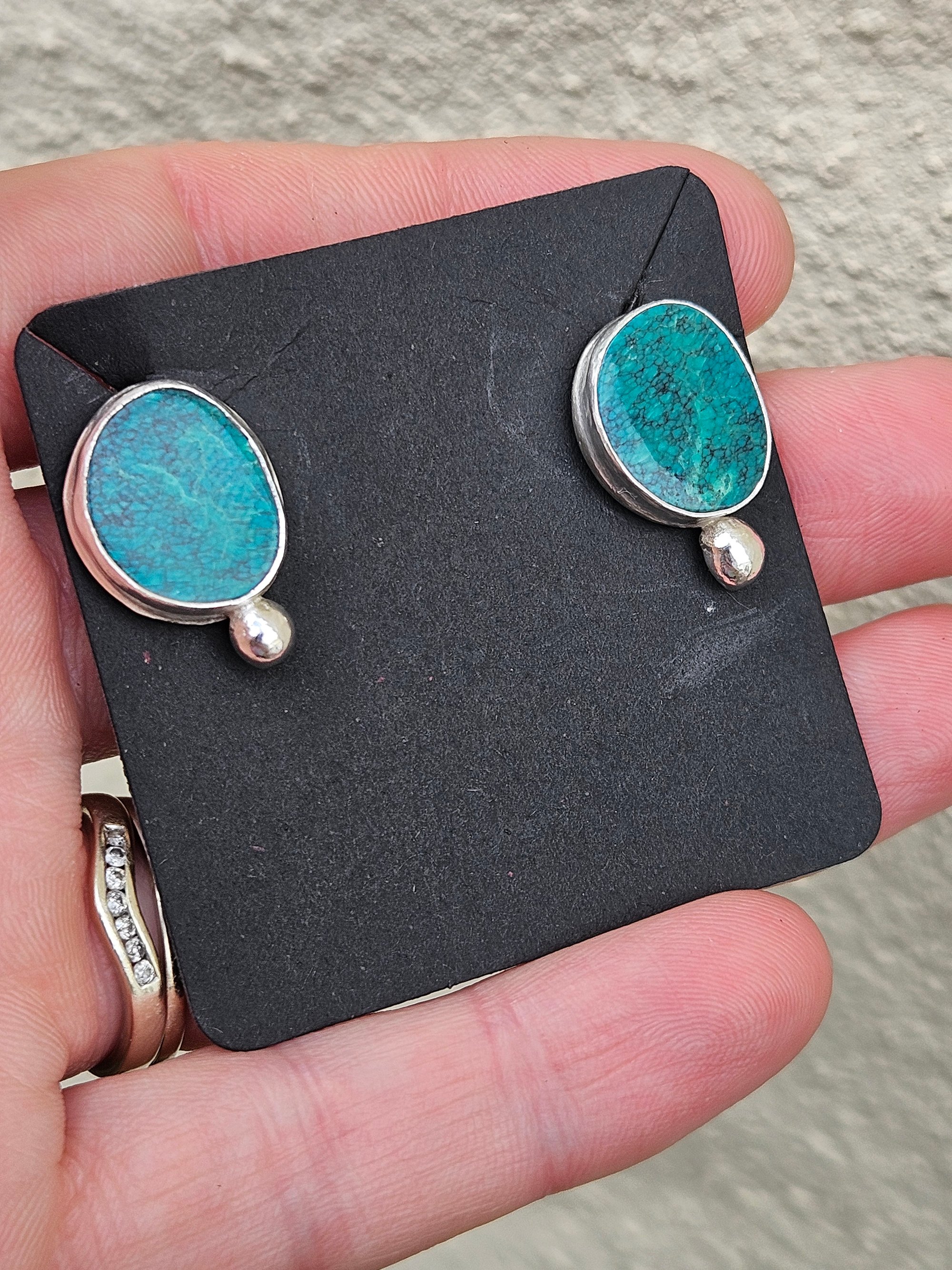 Handmade Sterling silver stud earrings featuring 15x12mm chinese turquoise cabochons which are stunning green and blue colours and remind me of beautiful tidal pools in the rock pools I see on my beach walks here in Cornwall. Please note the two are matched as best as possible but are slightly different shapes and sizes. I've bezel set them in sterling silver bezel wire with 0.3mm sterling silver backplate. Ive added a melted ball of recycled sterling silver underneath each one which really finishes them off. They have sterling silver posts and backs.