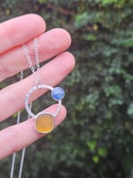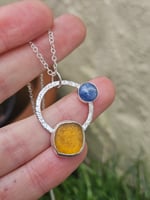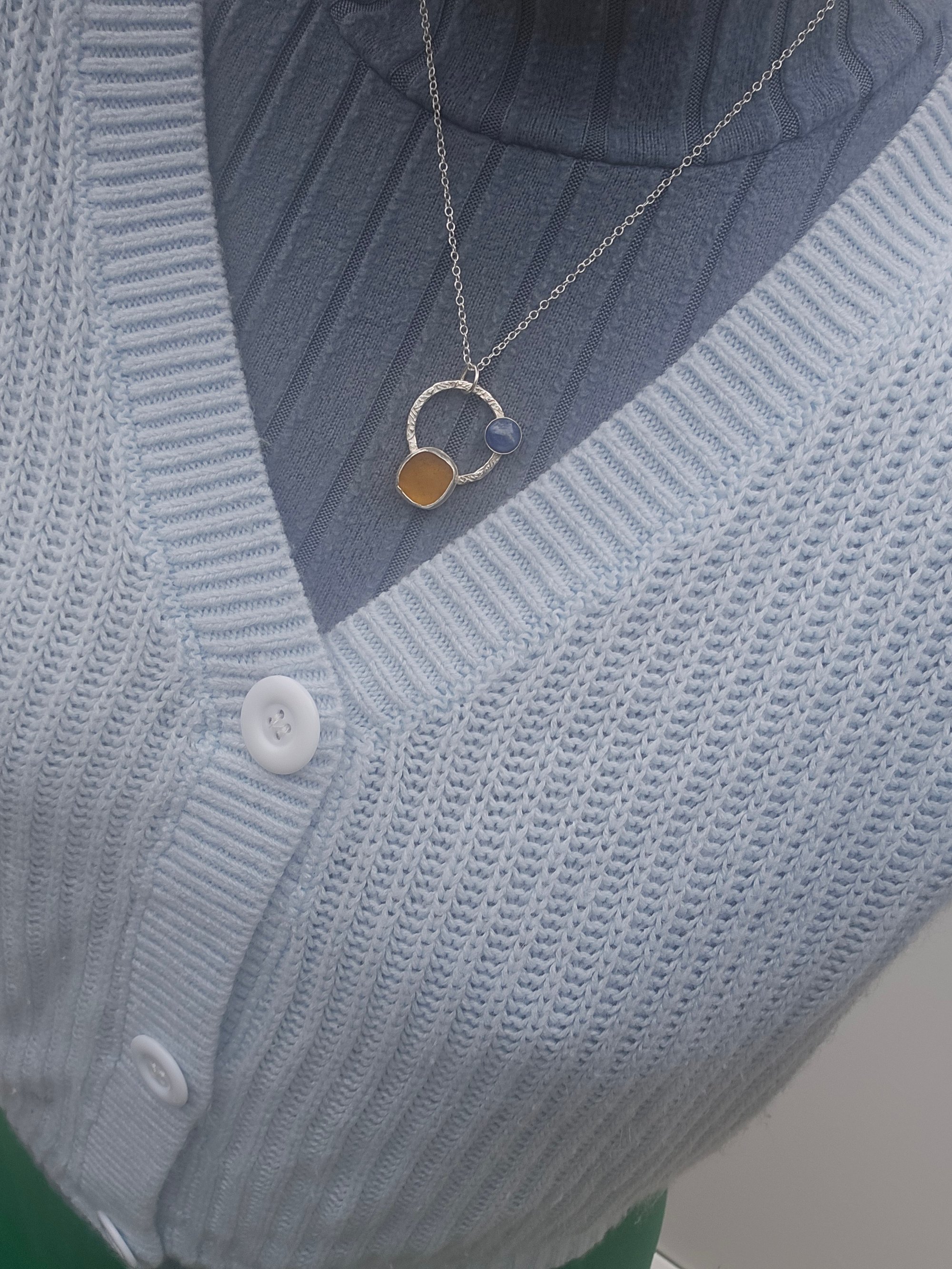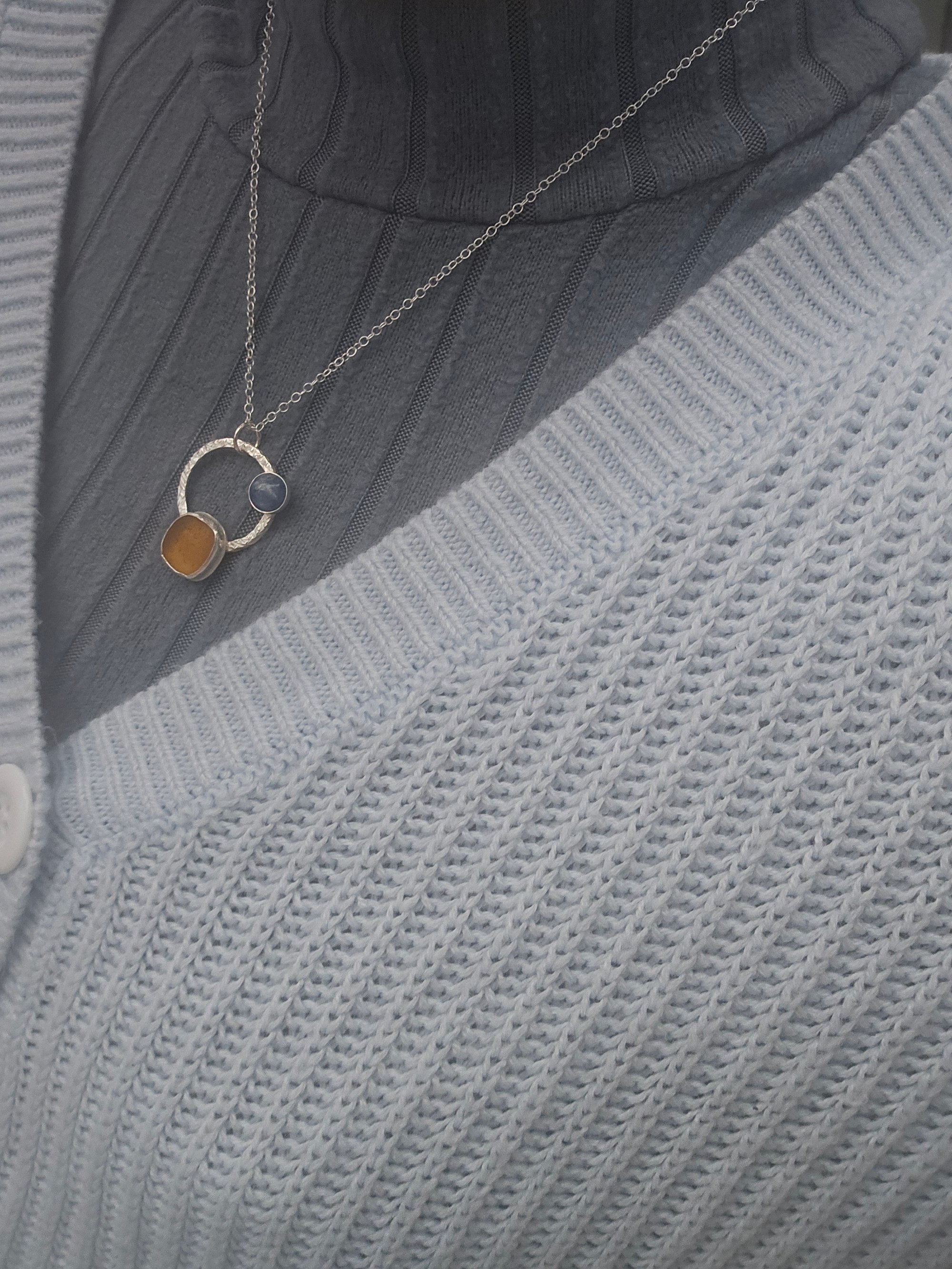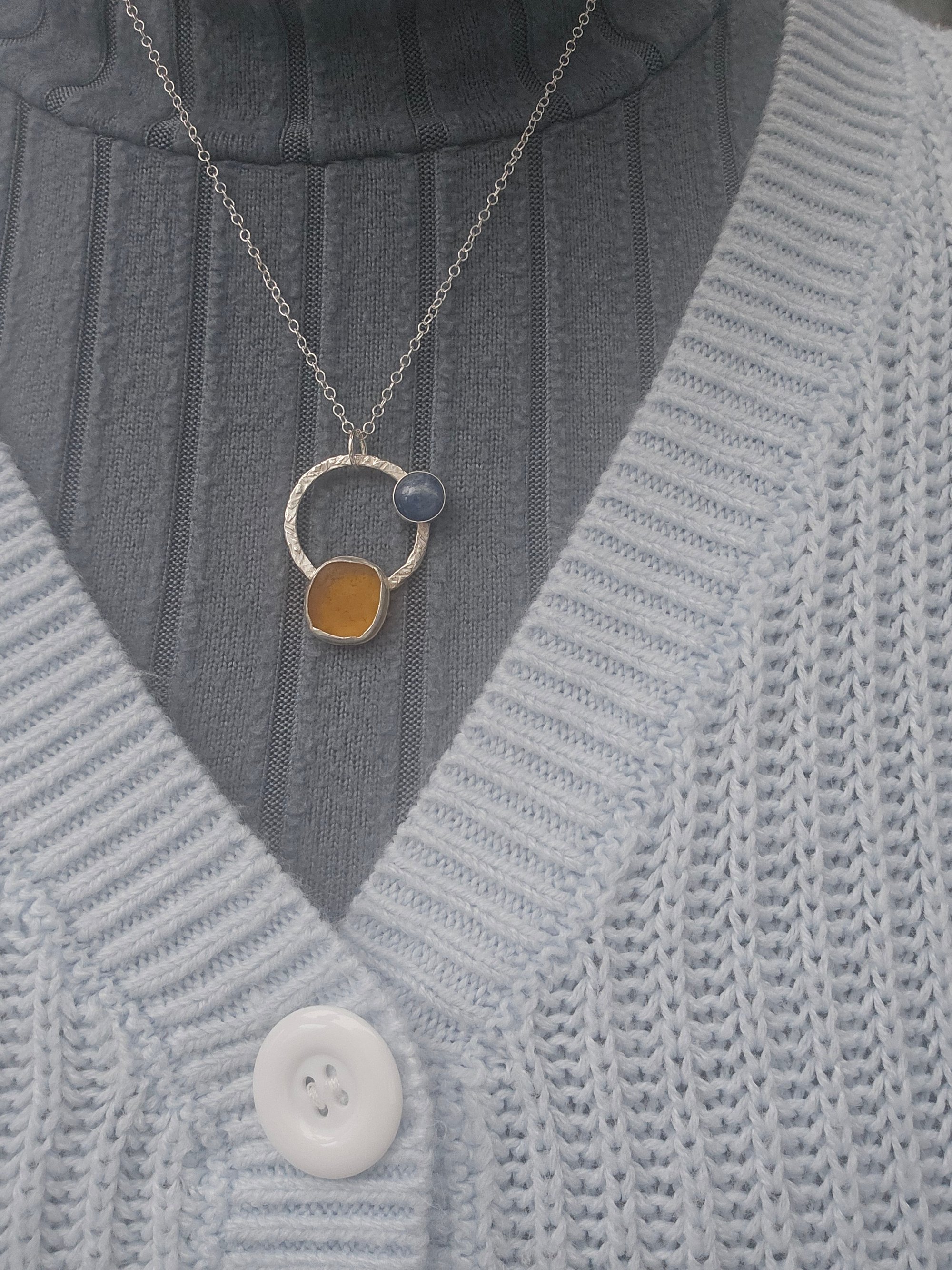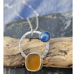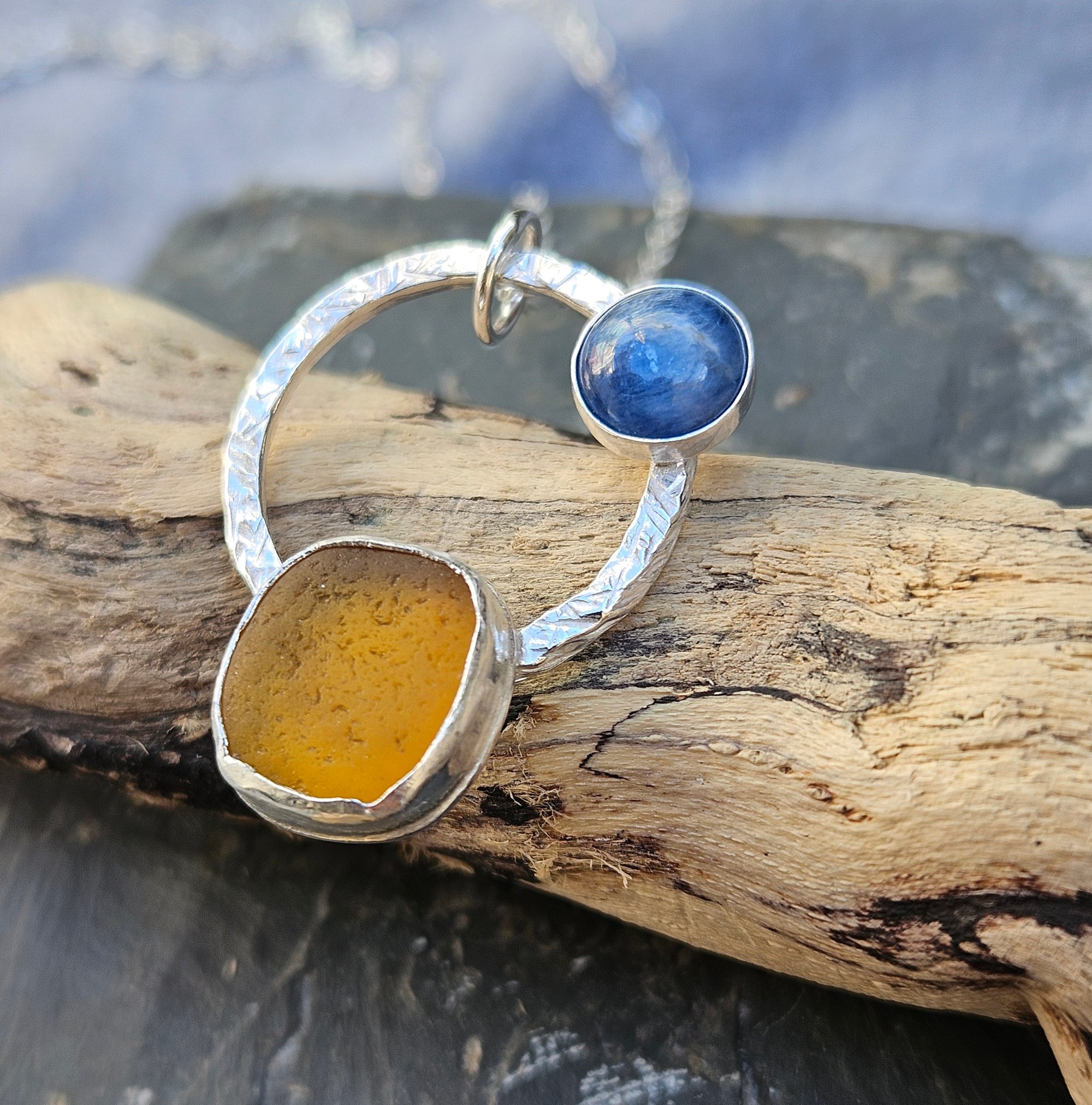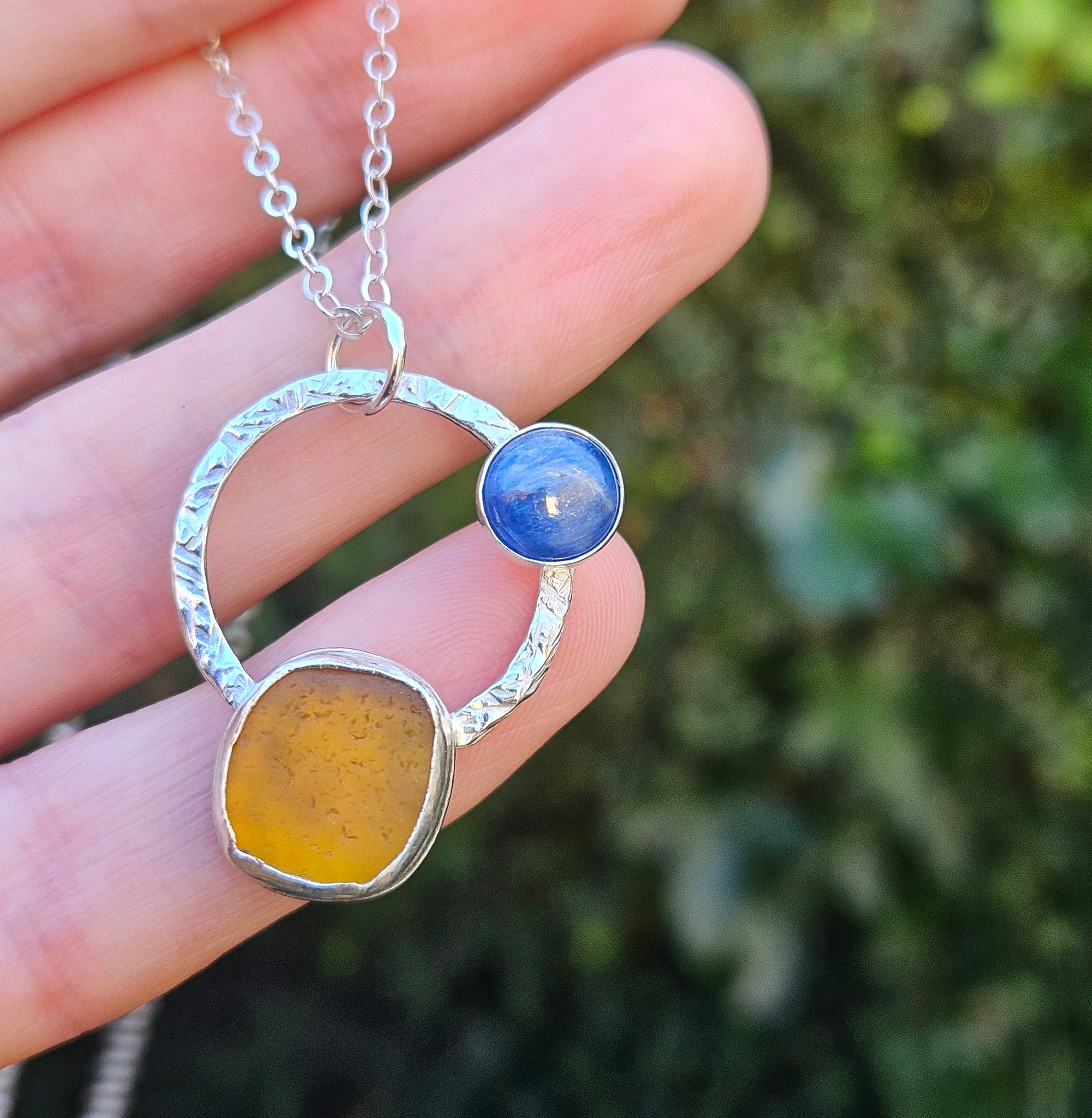 Handmade Sterling silver necklace featuring a handmade sterling silver hoop ive textured with my hammer with a criss cross pattern ive then added sterling silver bezel set orange seaglass ( which was found on a cornish beach on one of my local walks ) and also a bezel set 8mm round kyanite gemstone which is a stunning blue. I love the mix of the gemstone and seaglass together and the colours really pop! Especially when the sun shines onto the orange seaglass it really glows.